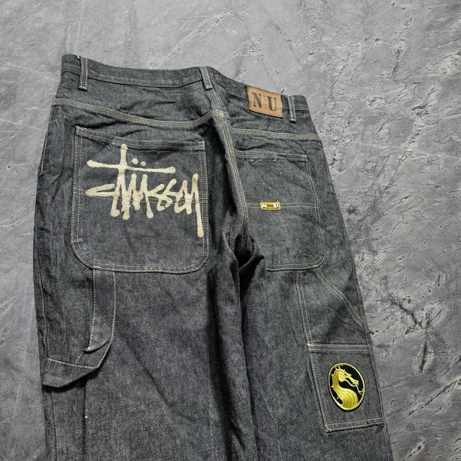 как выглядит Baggy Nu Wear Black Carpenter Wide Leg Jnco Style Skater Y2k Raw Denim Jeans 36 фото