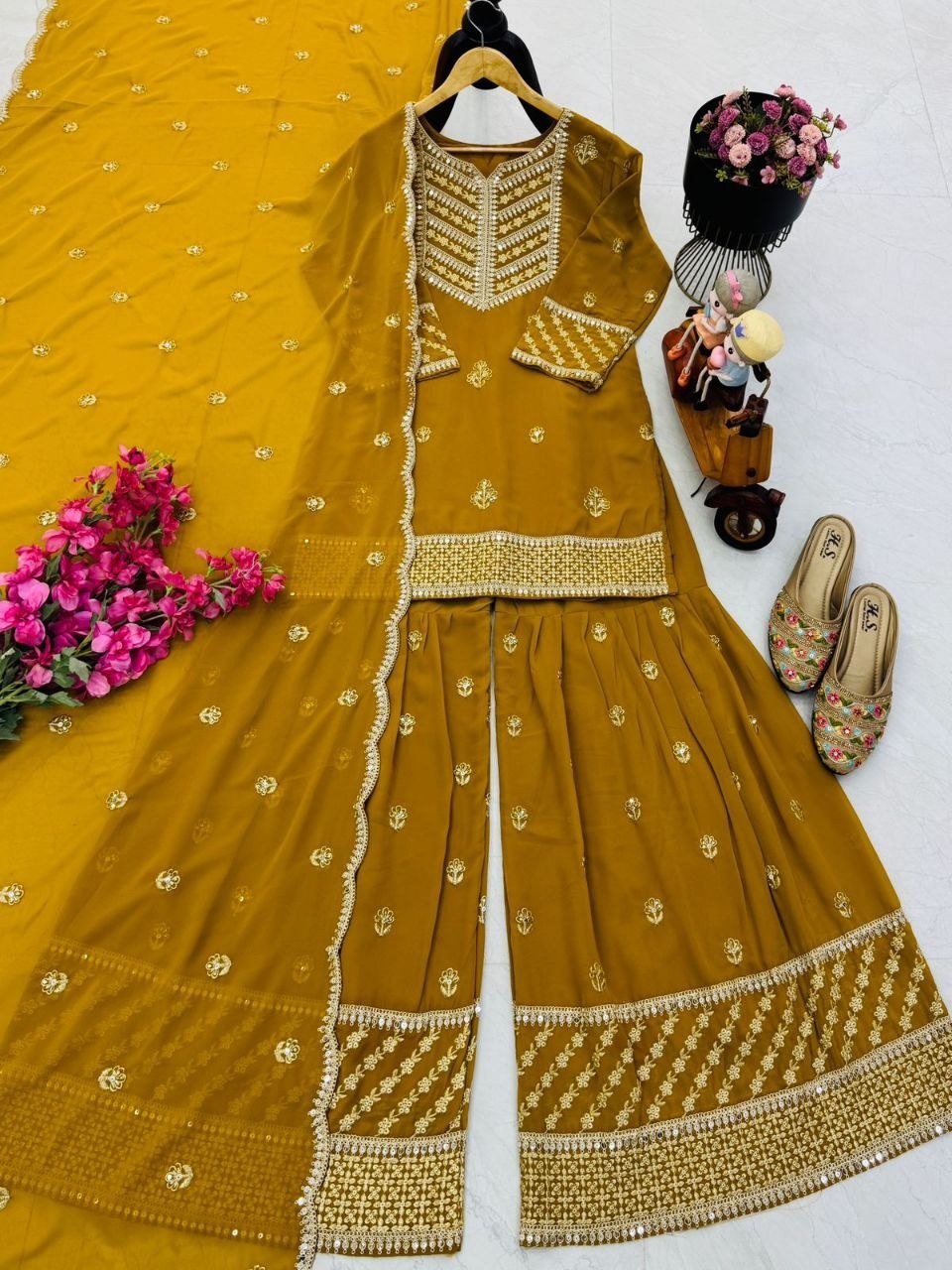 как выглядит Latest Faux Georgette Yellow Top Palazzo With Dupatta For Reception Party Wear фото