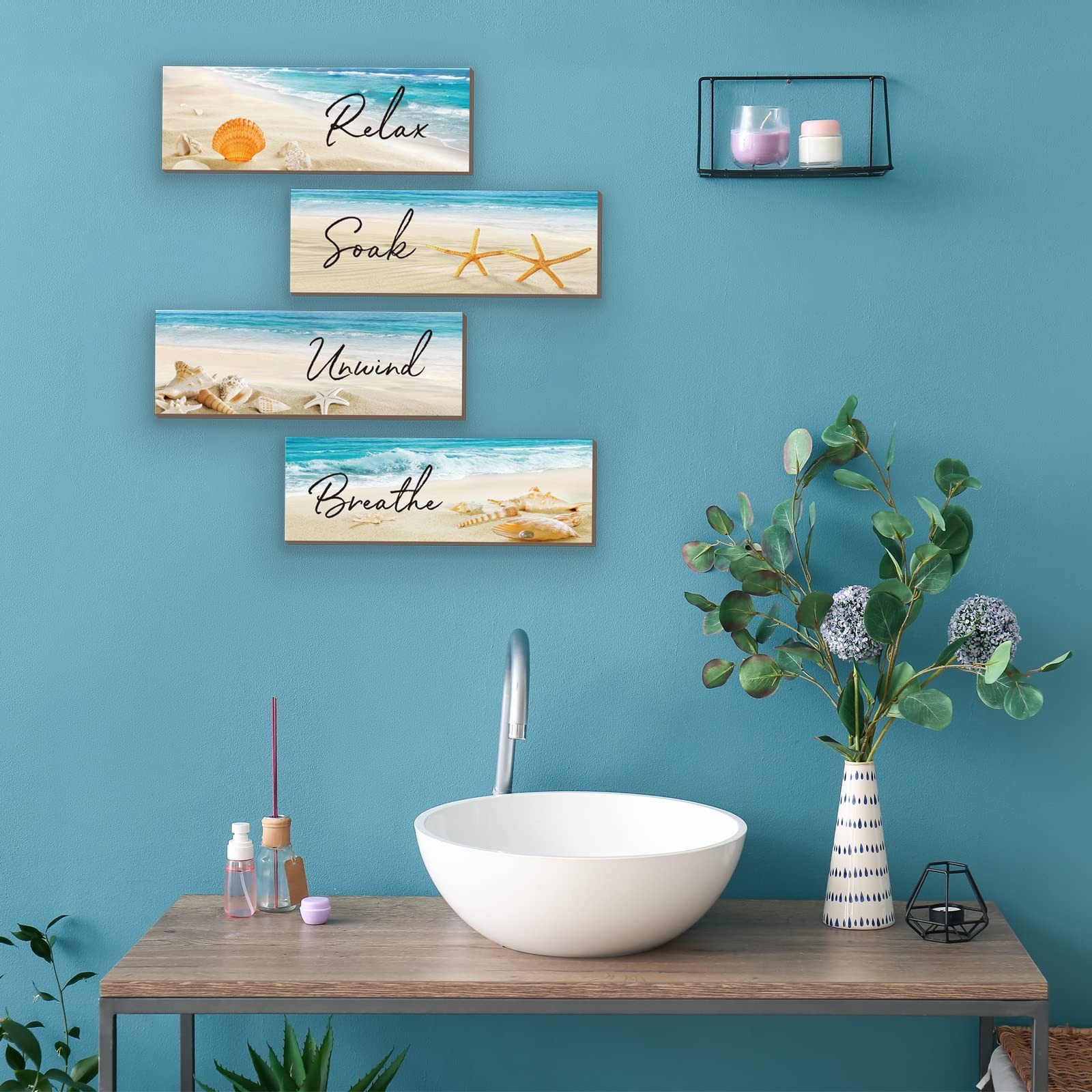 4 Pieces Beach Bathroom Decor Ocean Beach Wall Decors Relax Soak Unwind Breat...