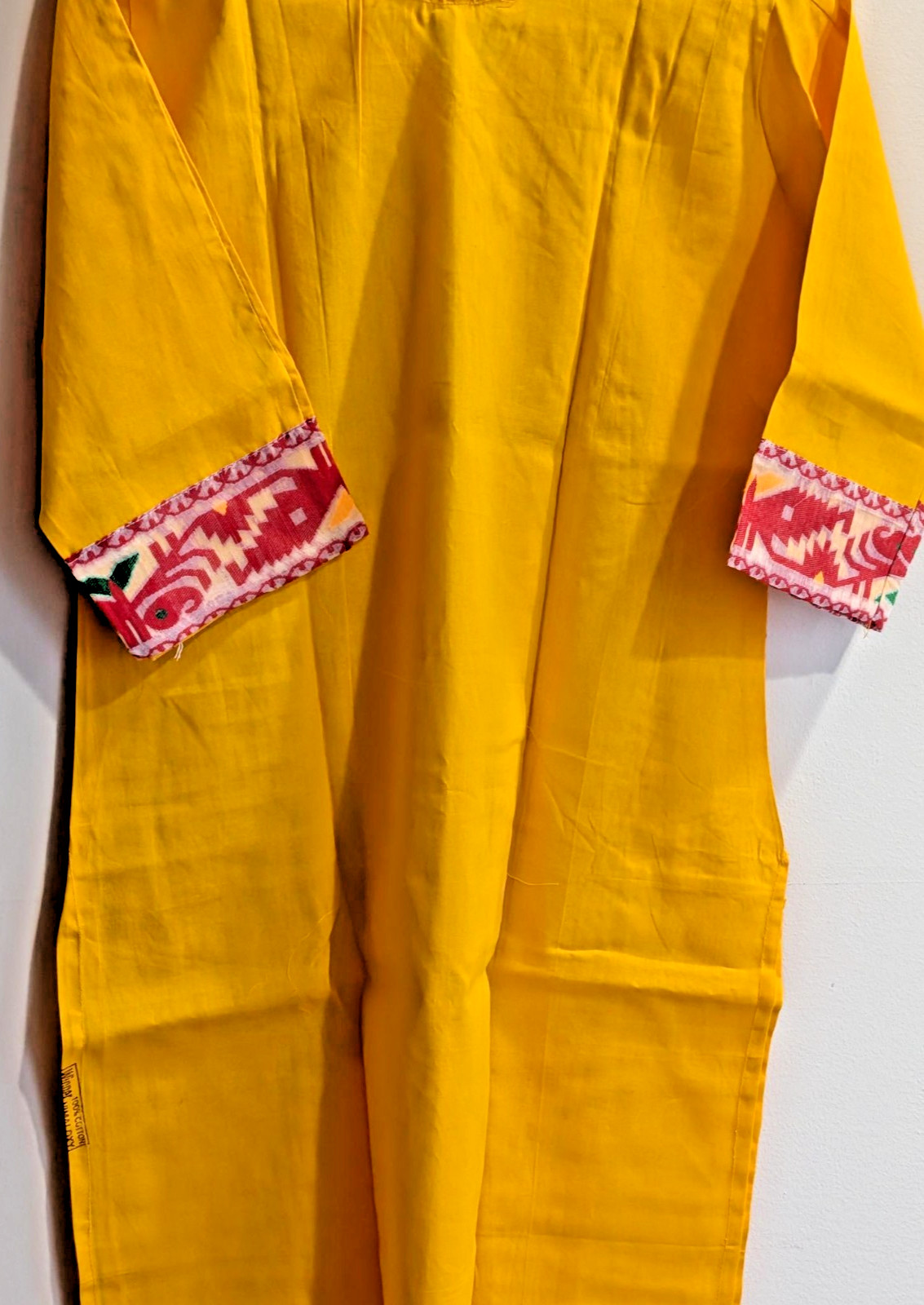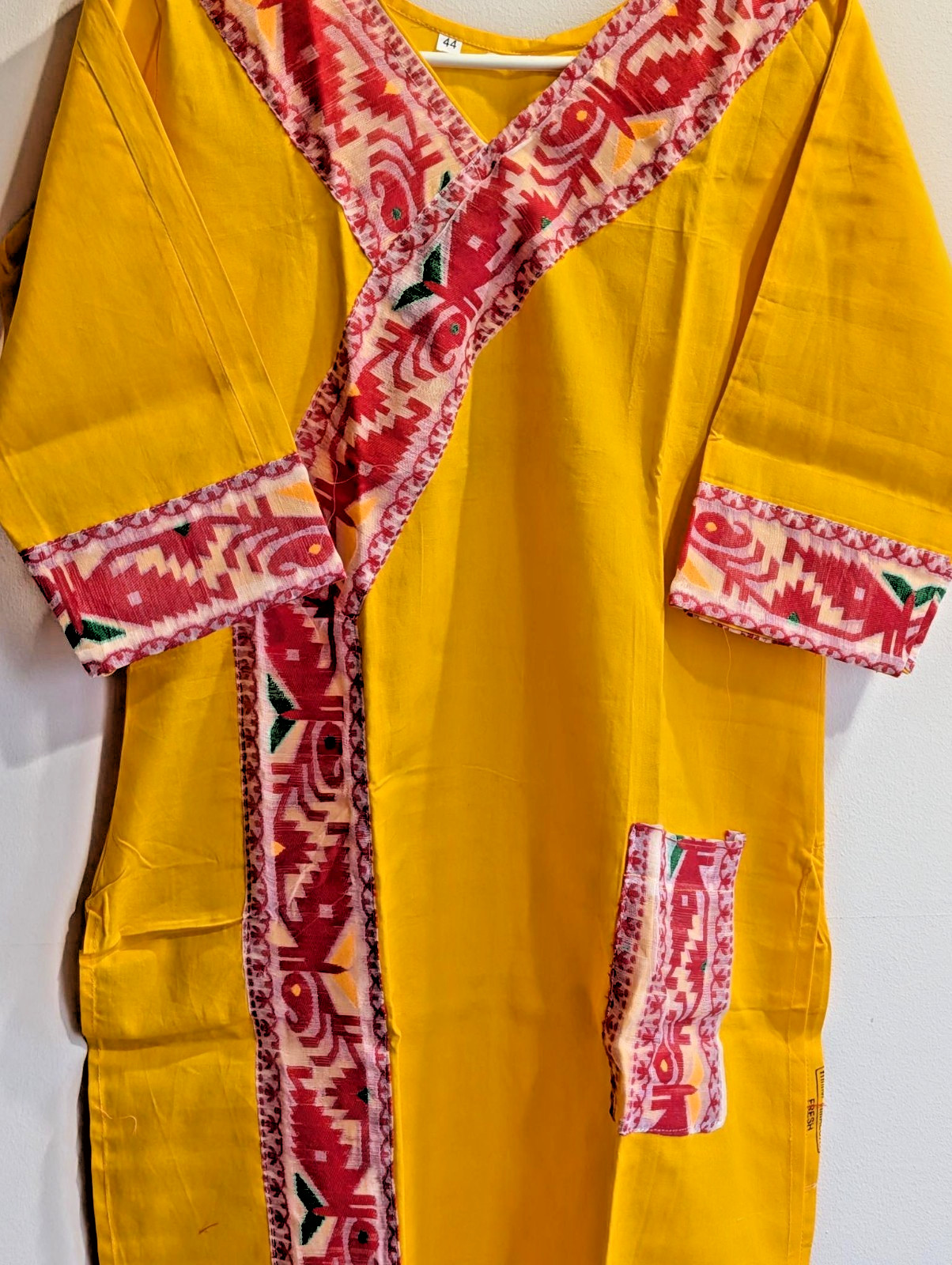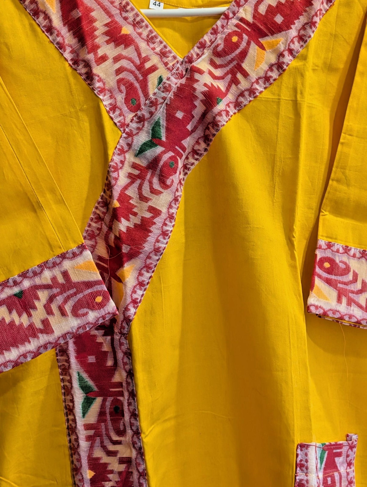 Kurta Top Tunic Jamdani Embroidery V-Neck Yellow Cotton Lightweight 40 x 21