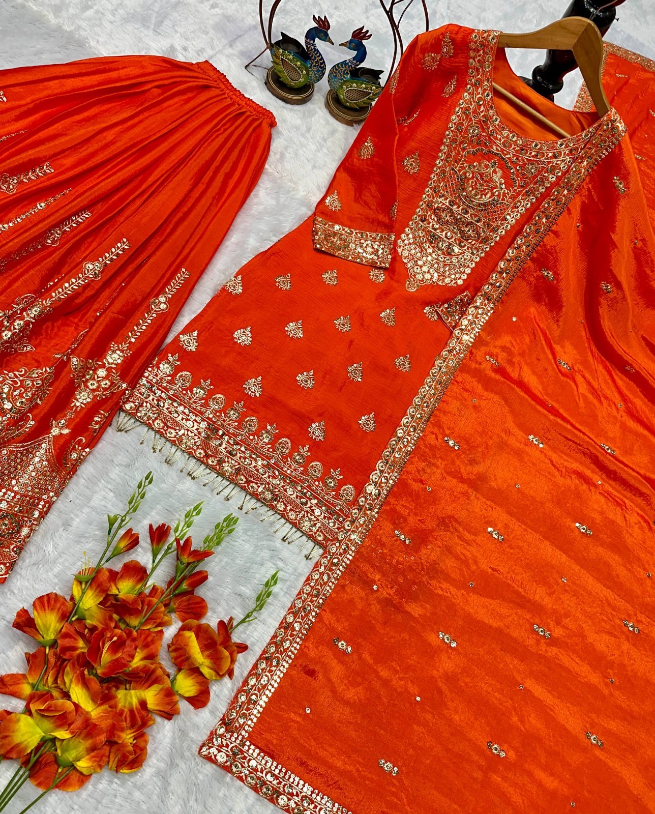Presenting Heavy Chinon Silk Orange Top Palazzo With Dupatta For Wedding Party