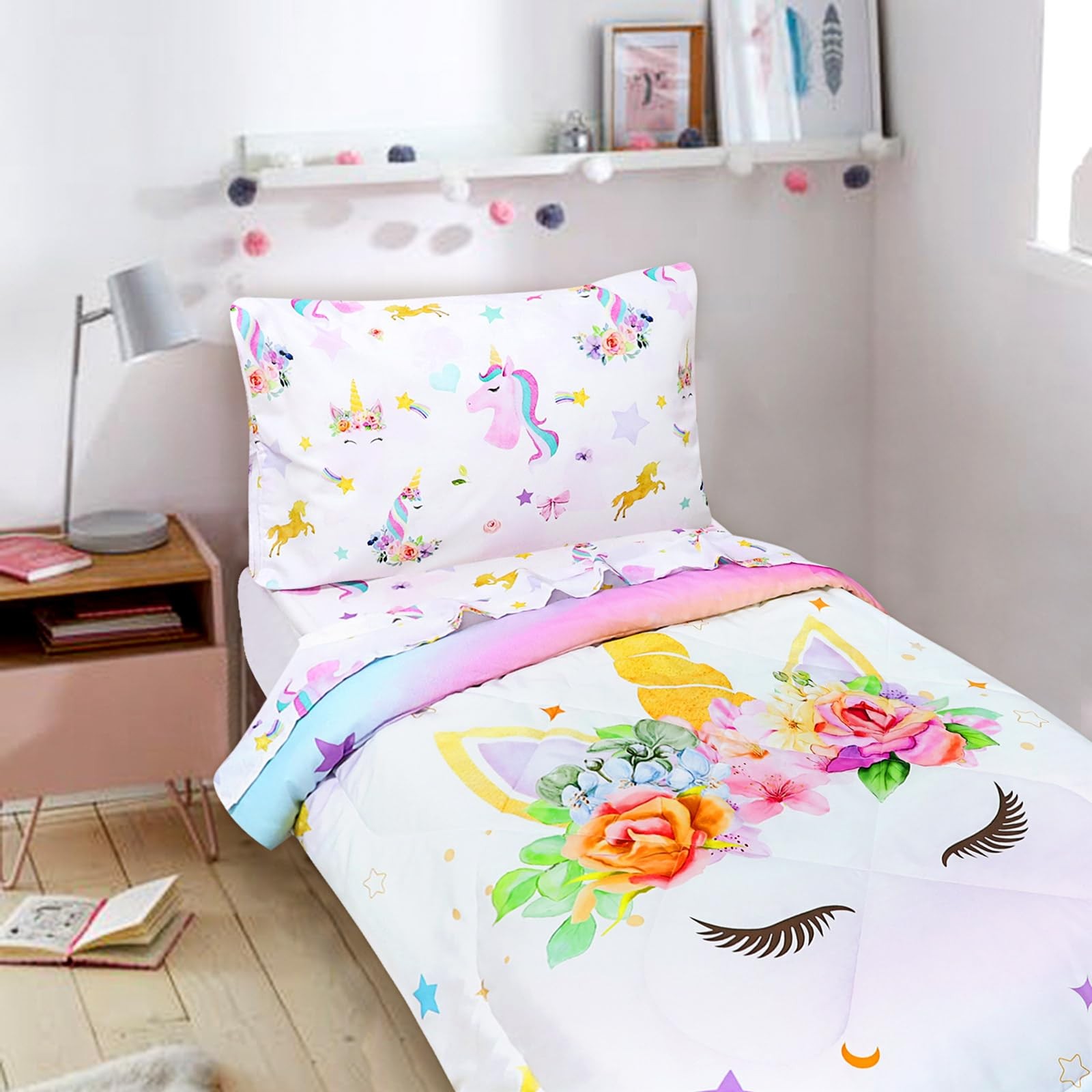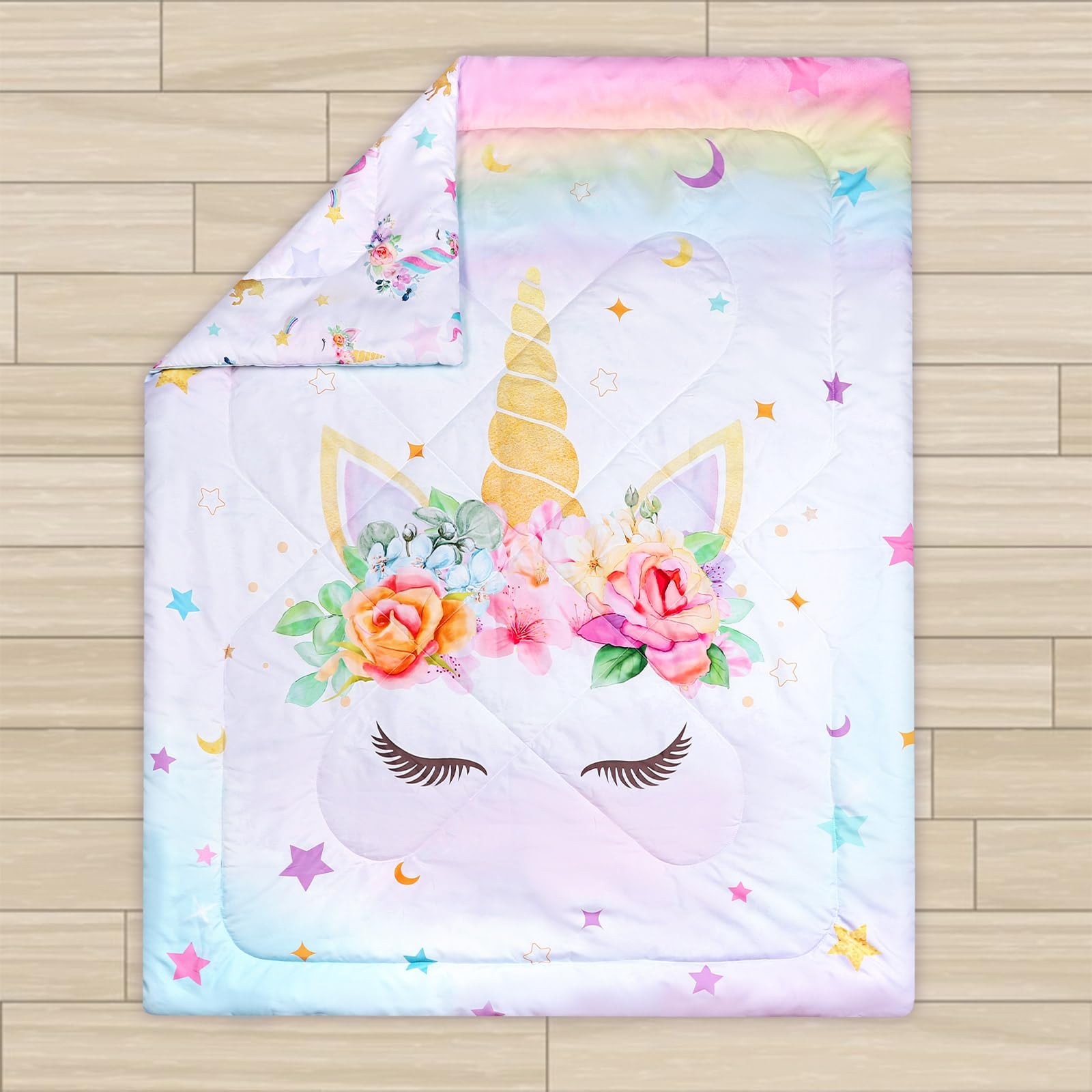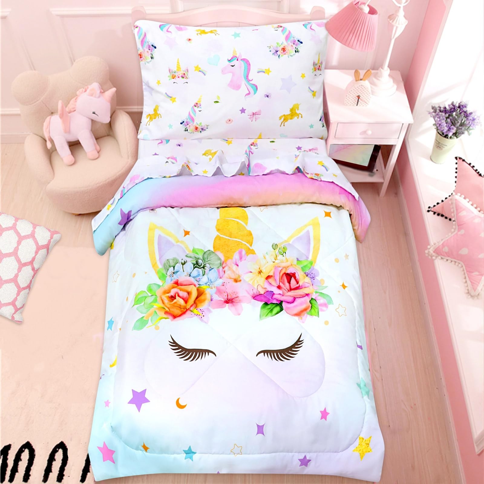 Bedding Sets for Girls, Unicorn Crib Bedding Set 4 Piece Pink Floral Comforte...