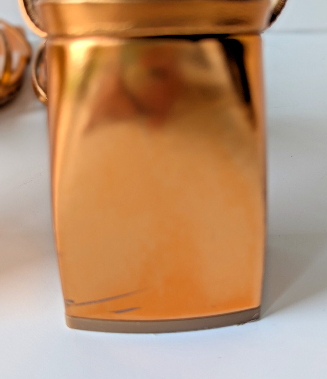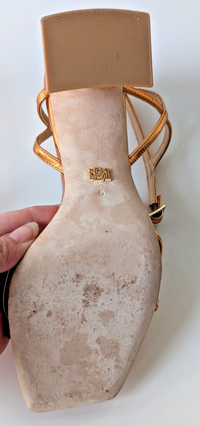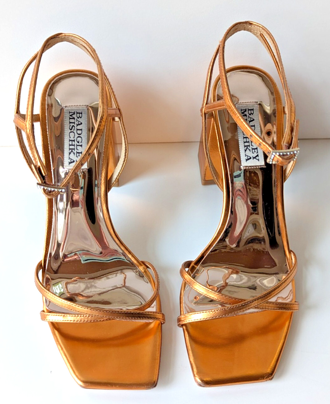 как выглядит Badgley Mischka Ivanka Gold Strappy Heels Sz 6 3.5" Block Heel Open Toe Club фото