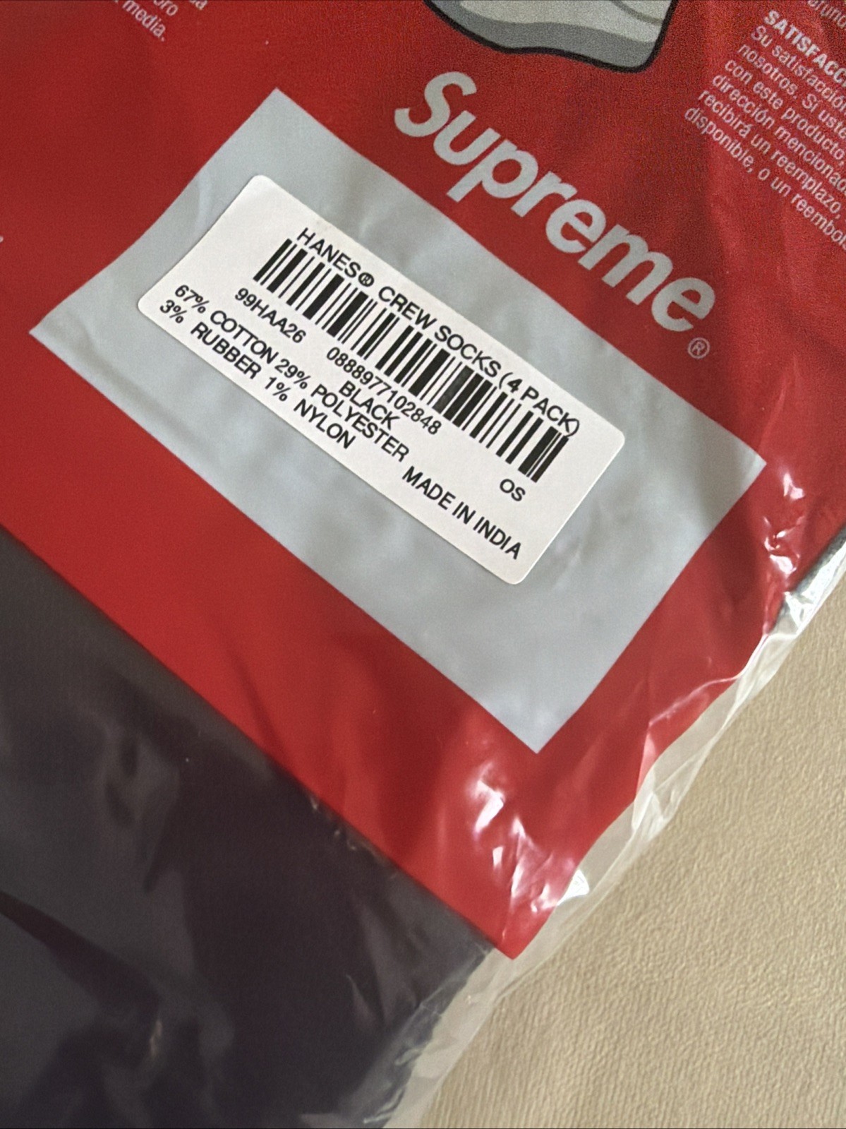 Supreme Hanes Crew Socks - Black 4 Pack, Size 6-12