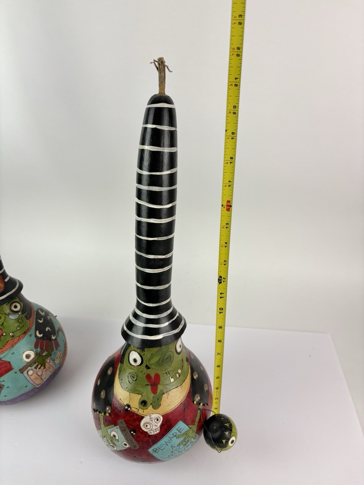 • 2 Jeni Gochnour Halloween Folk Art Painted Gourd Pumpkin Art Funky Witch 35 22