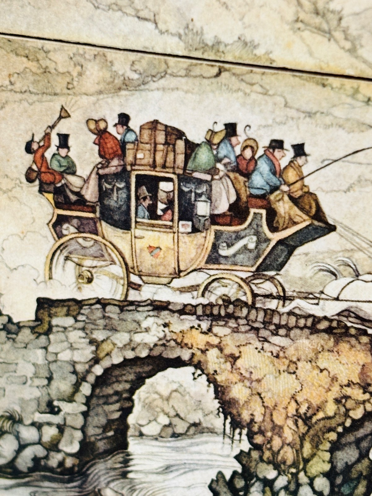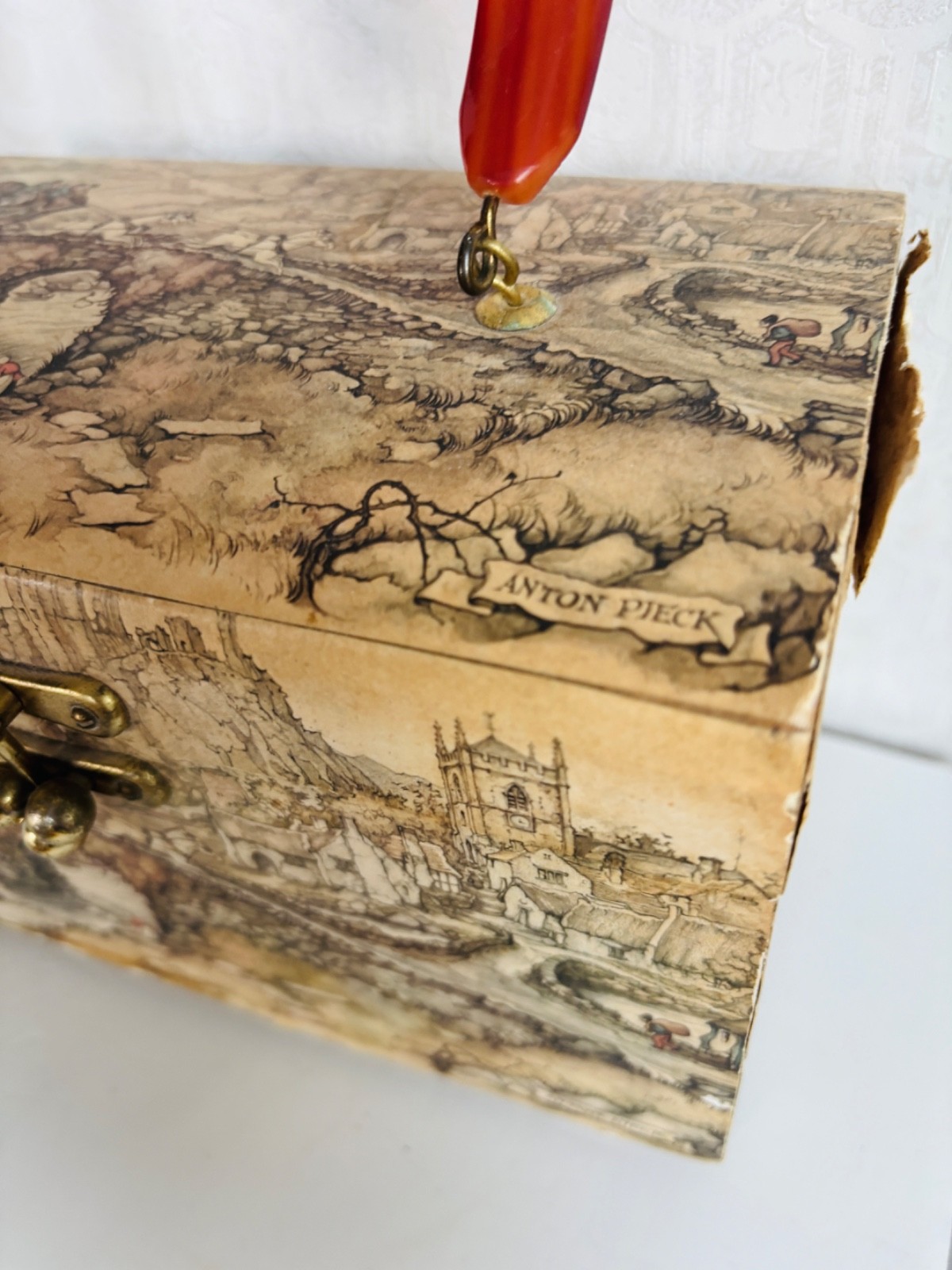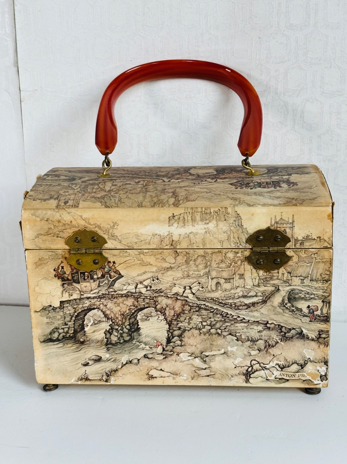 VTG ANTON PIECK MCM DECOUPAGE WOOD BOX BAG PURSE TOWN PAPER HAS FLAWS NOT COATED