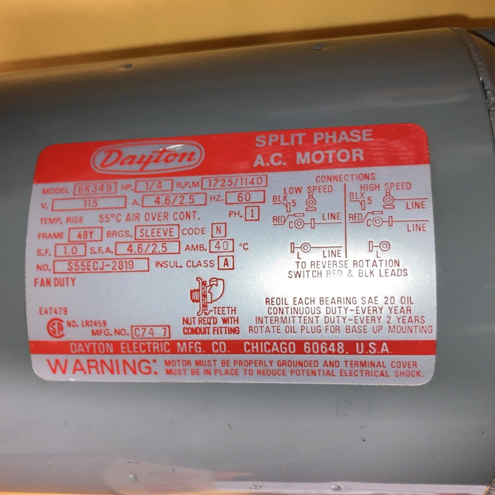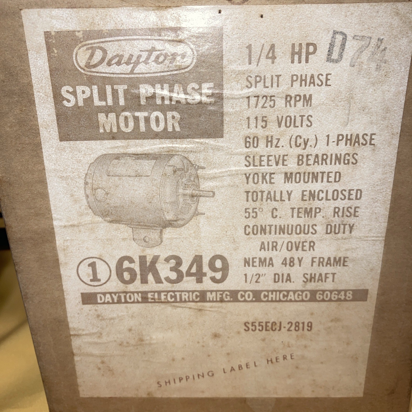 Dayton 6K349 Split Phase Motor 1/4 HP 1725/1140 RPM NEW OLD STOCK, OPEN BOX