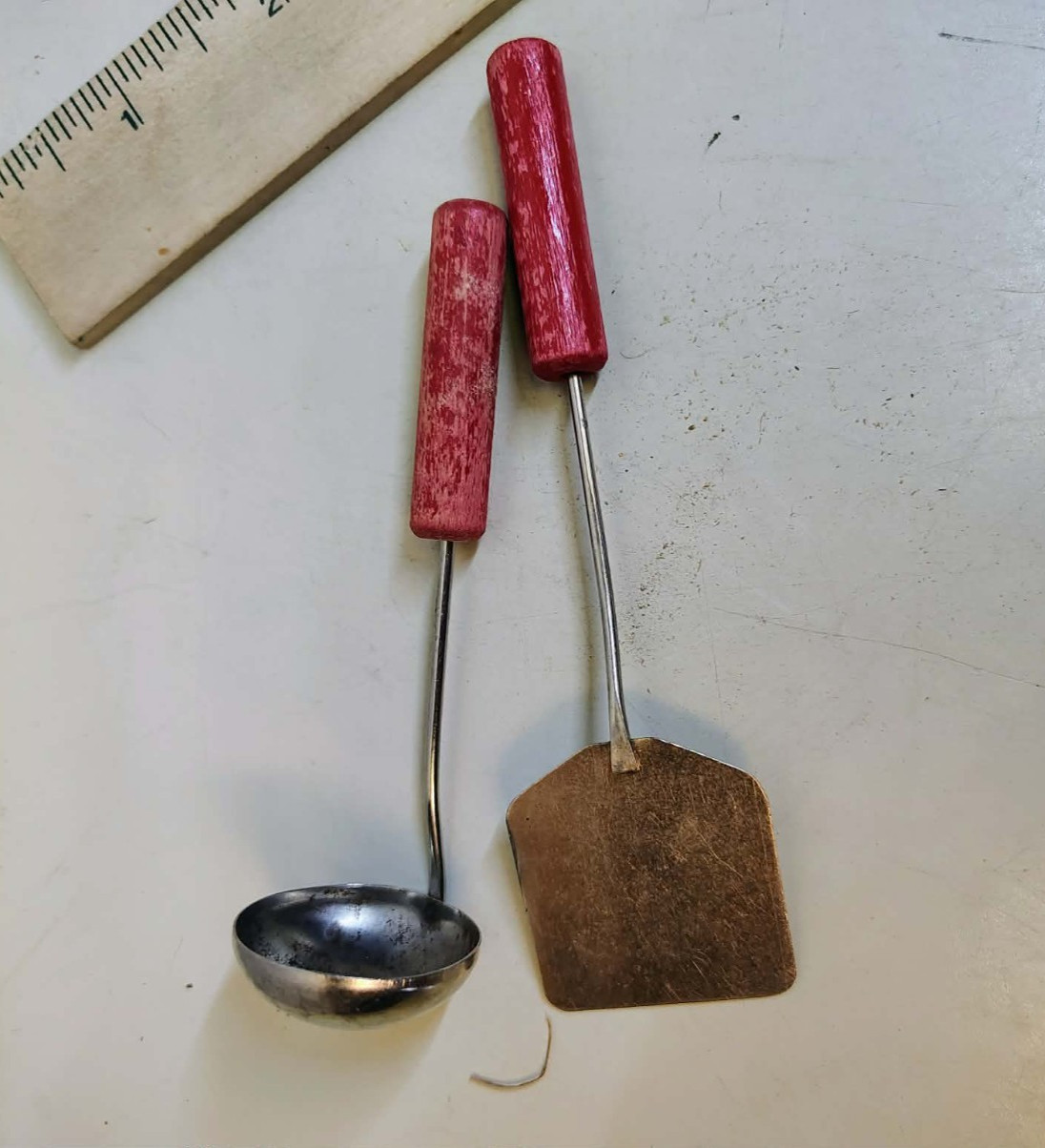 Vintage Kid's Kitchen Play Utensils Metal Red Wood Handle Spatula Ladle
