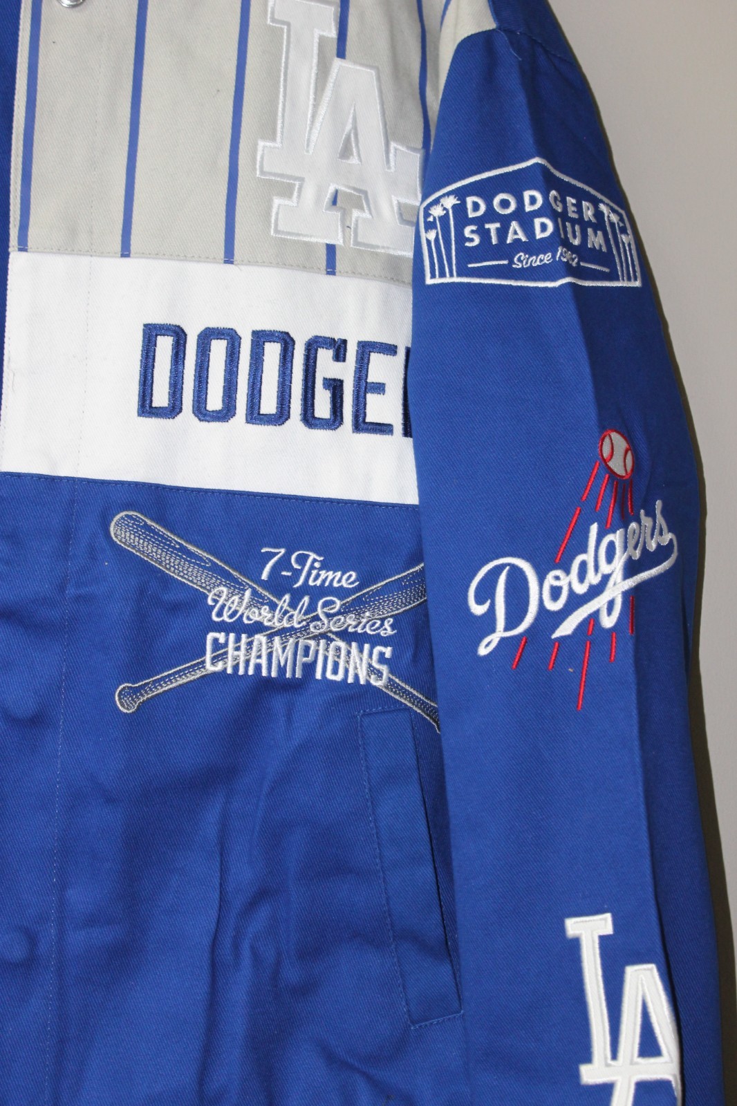 как выглядит New MLB Los Angeles Dodgers NASCAR style twill cotton embroidery jacket mens L фото
