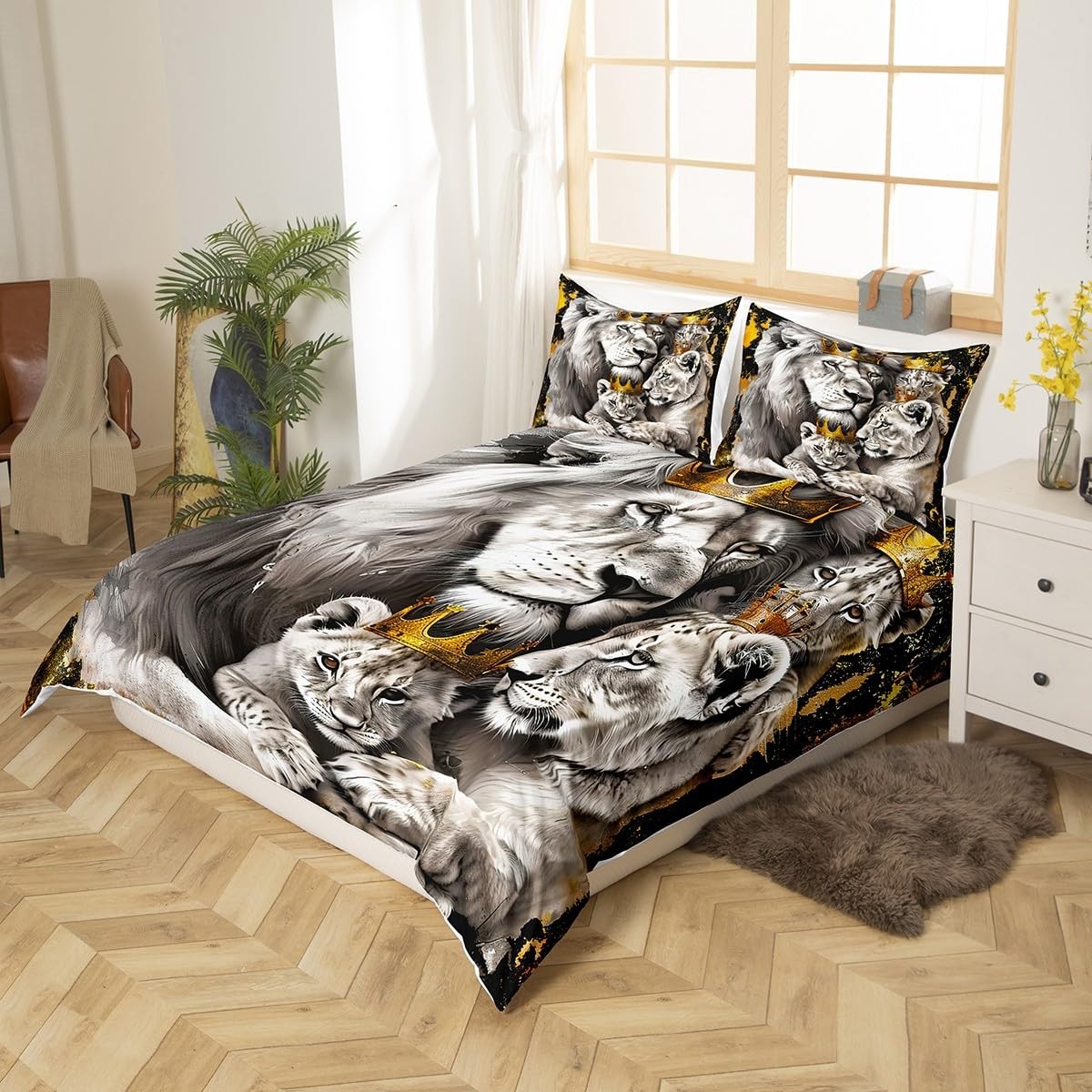 Lion Family Kids Duvet Cover Set Full Size,Gold King and Queen Crown Bedding ...