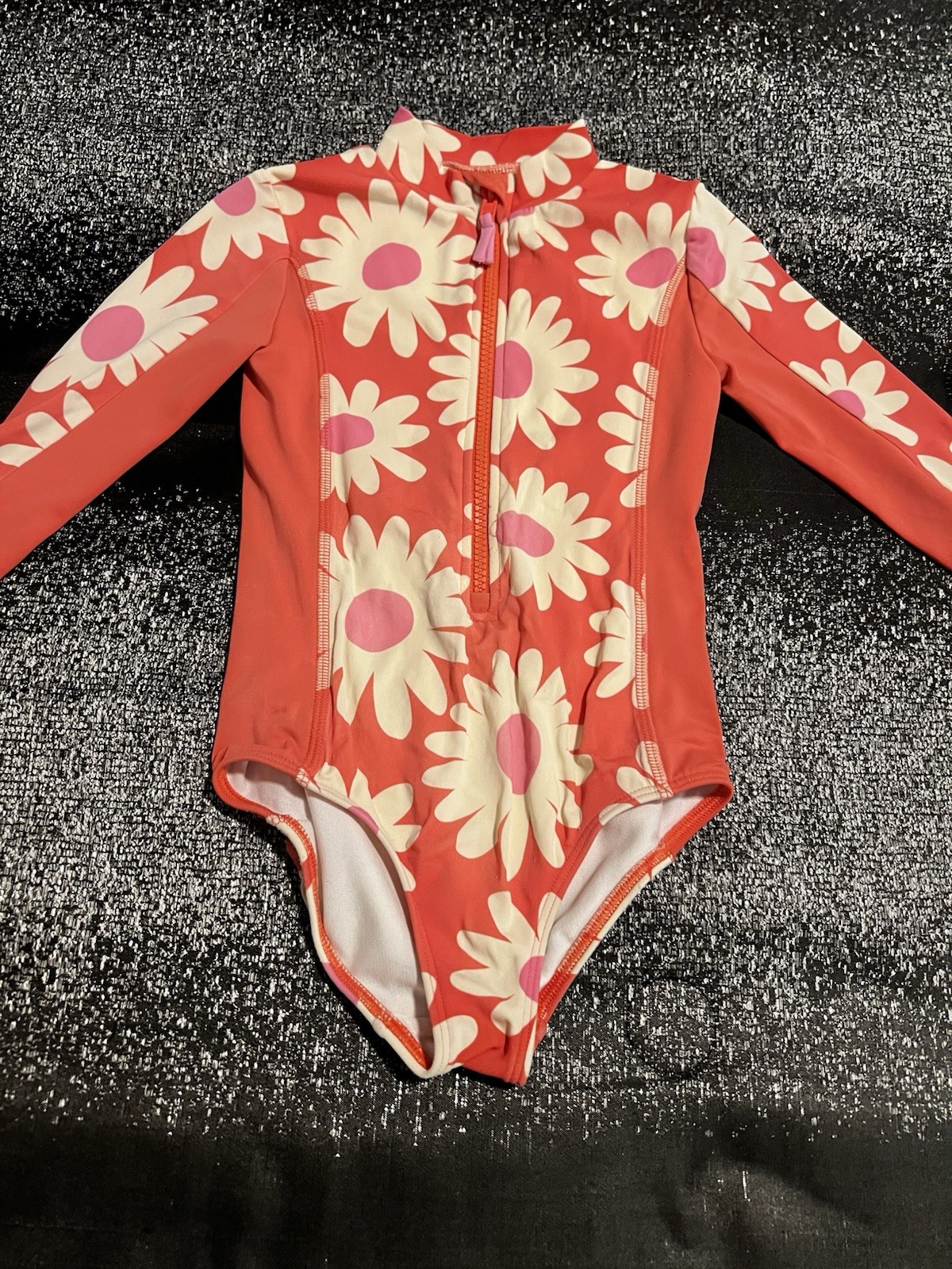 Girls 5-6 years Mini Boden long-sleeved swimsuit-cayenne red daisy print