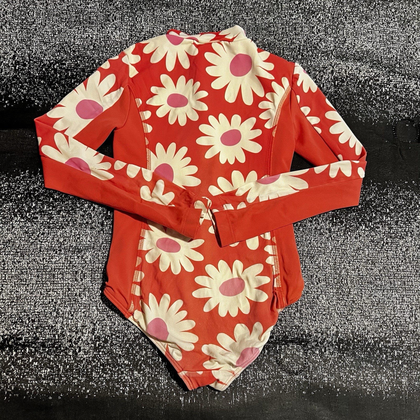 как выглядит Girls 5-6 years Mini Boden long-sleeved swimsuit-cayenne red daisy print фото