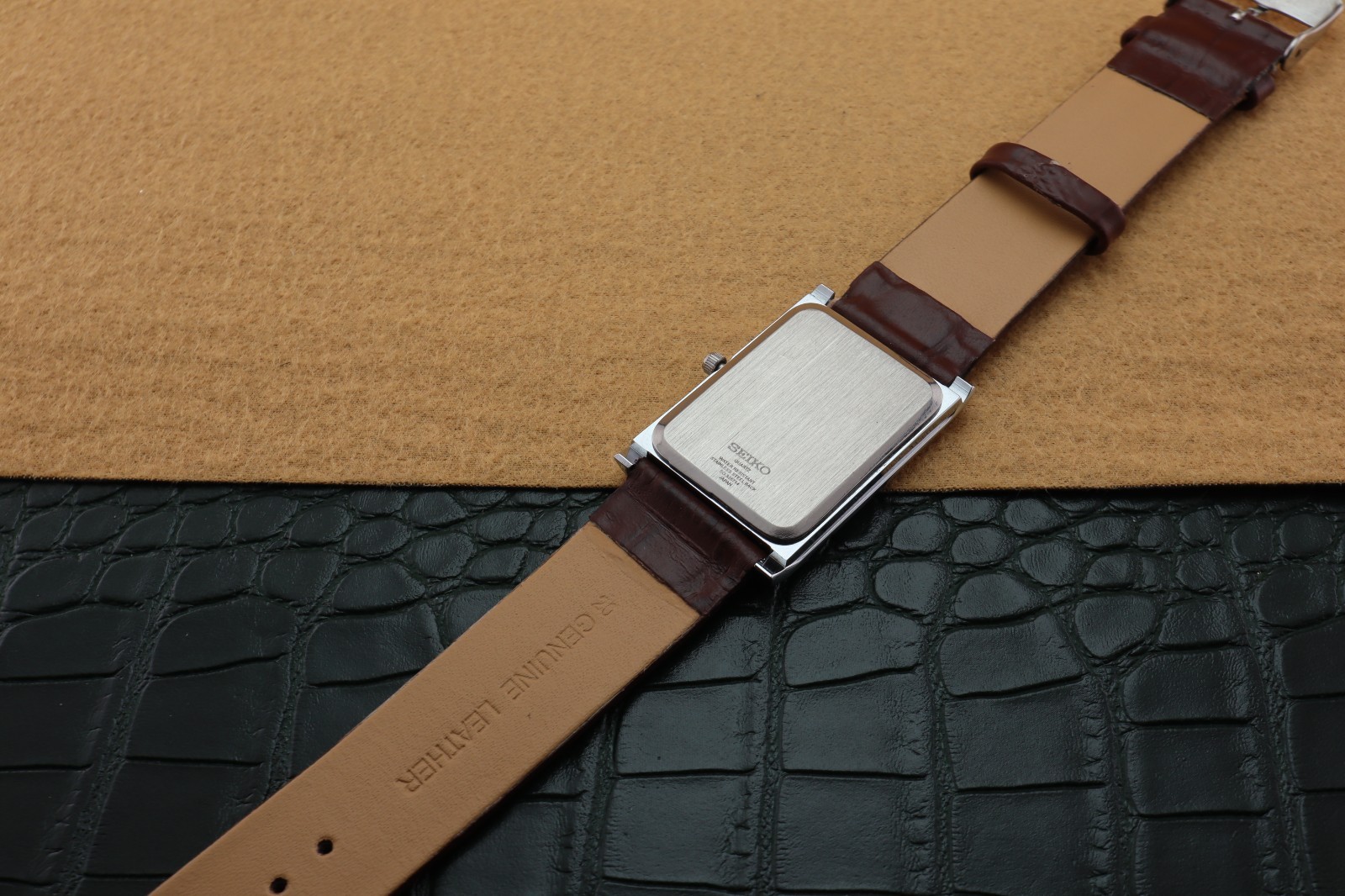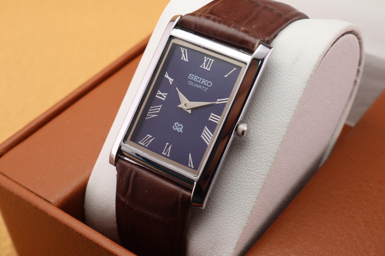 Vintage Seiko Slim Quartz Men's Wrist Watch Blue Dial with Dark Brown Strap.