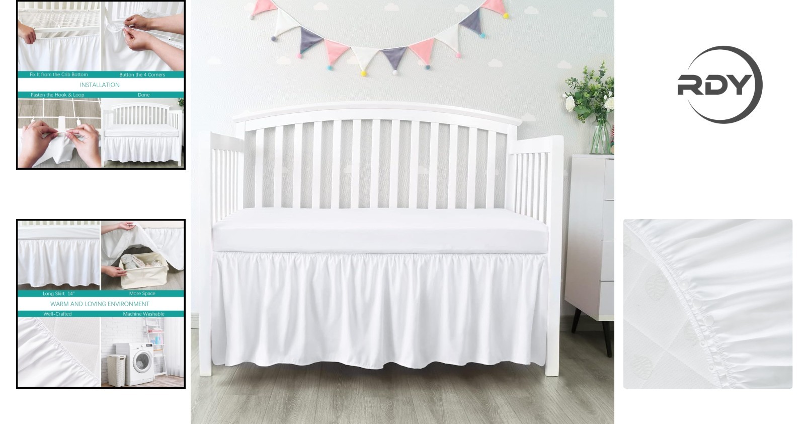 как выглядит Solid White Crib Bed Skirt 28 x52 - Durable Fabric with Pleated Design фото