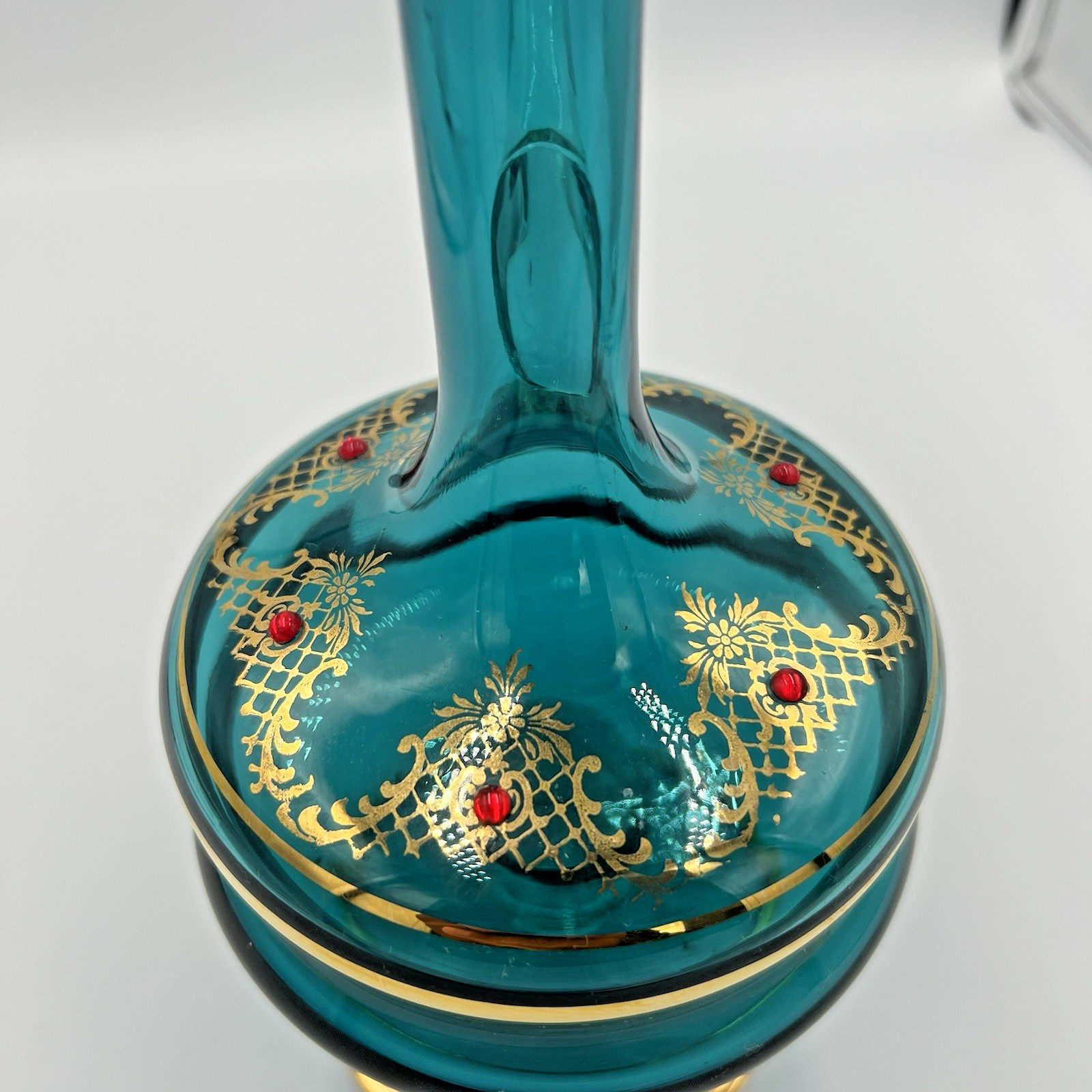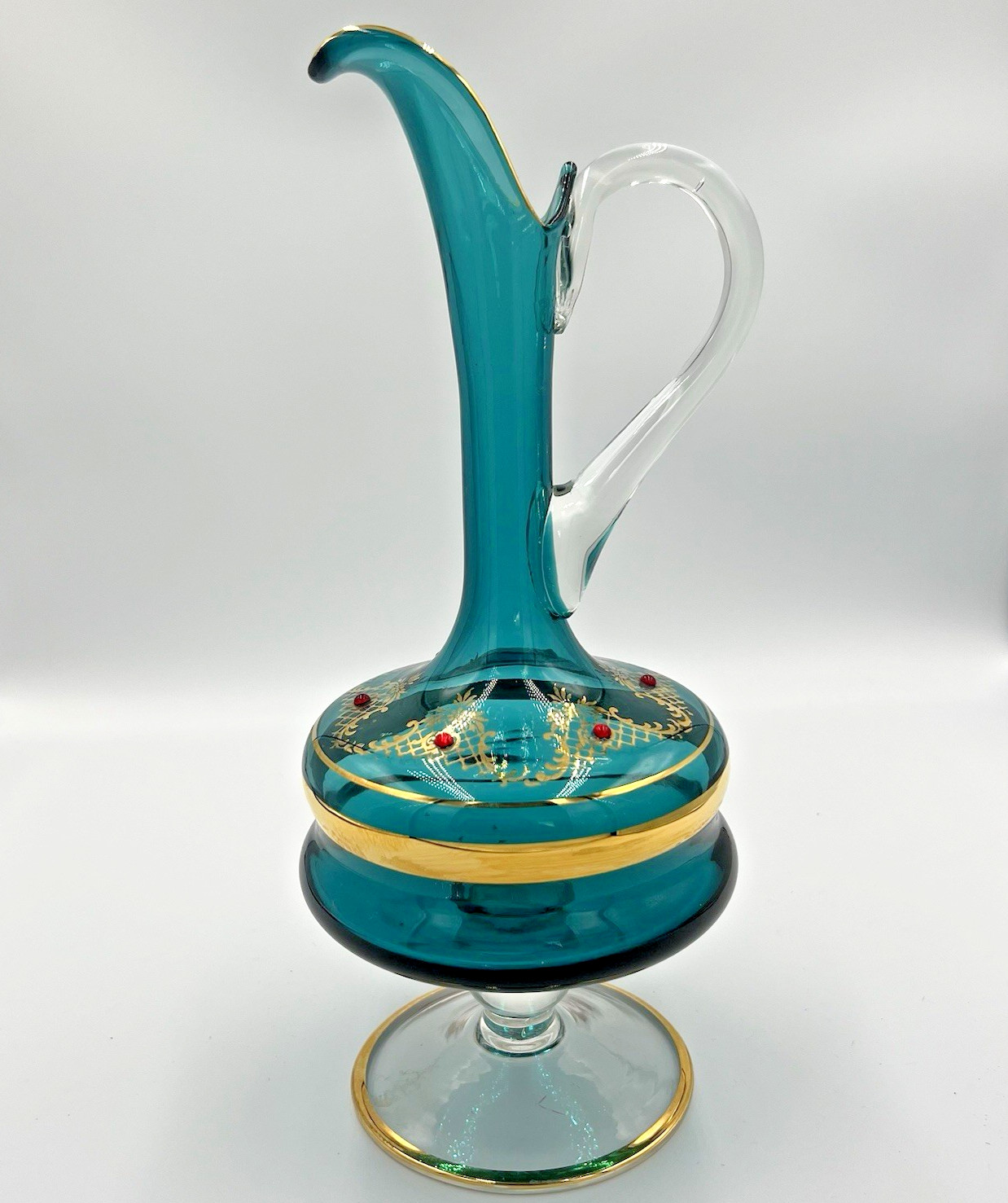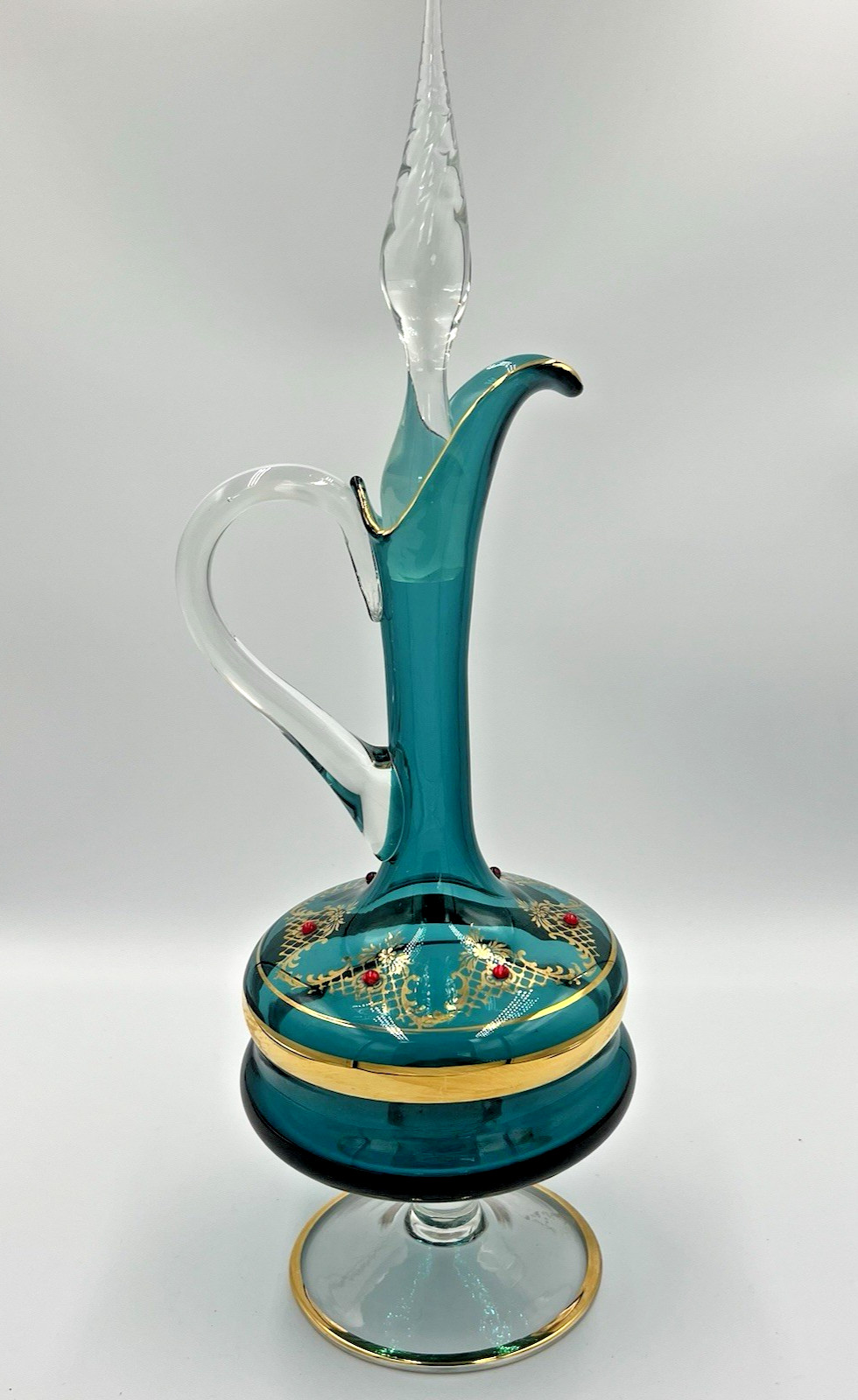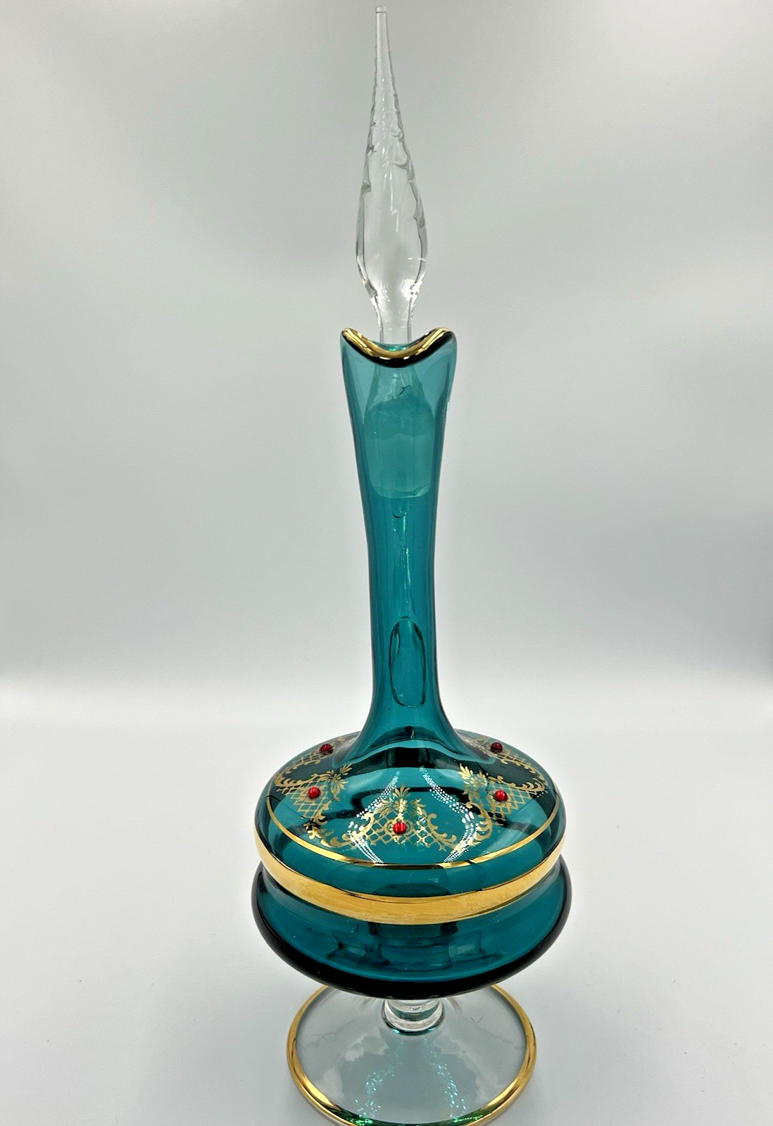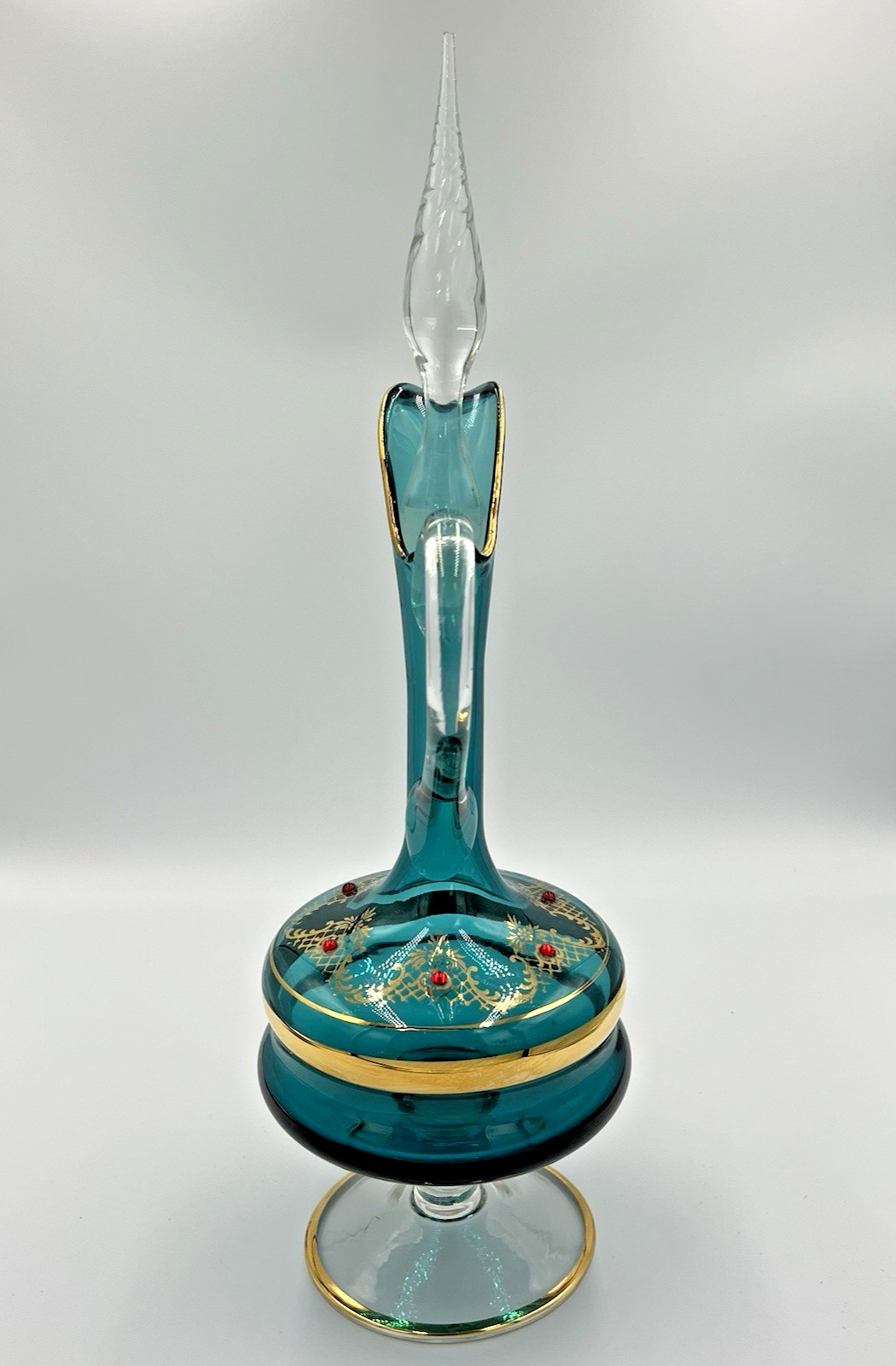 VTG Empoli Venetian Teal Blue Gold Genie Bottle Decanter 5 Glasses Stopper