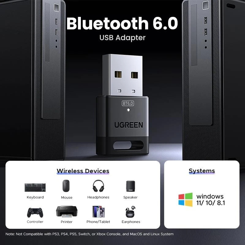 USB Bluetooth 6.0 Adapter Dongle for PC Win11/10 Receiver Transmitter Mouse