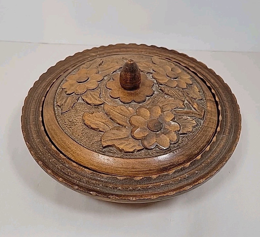 VTG 8 Carved Dark Wood Bowl W/lid Trinket Box Floral Design Scalloped Edges