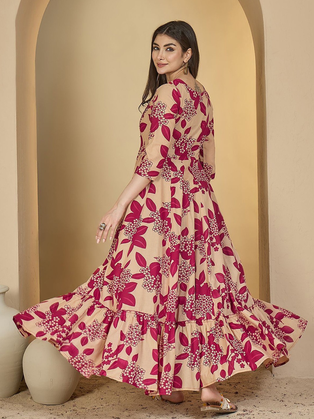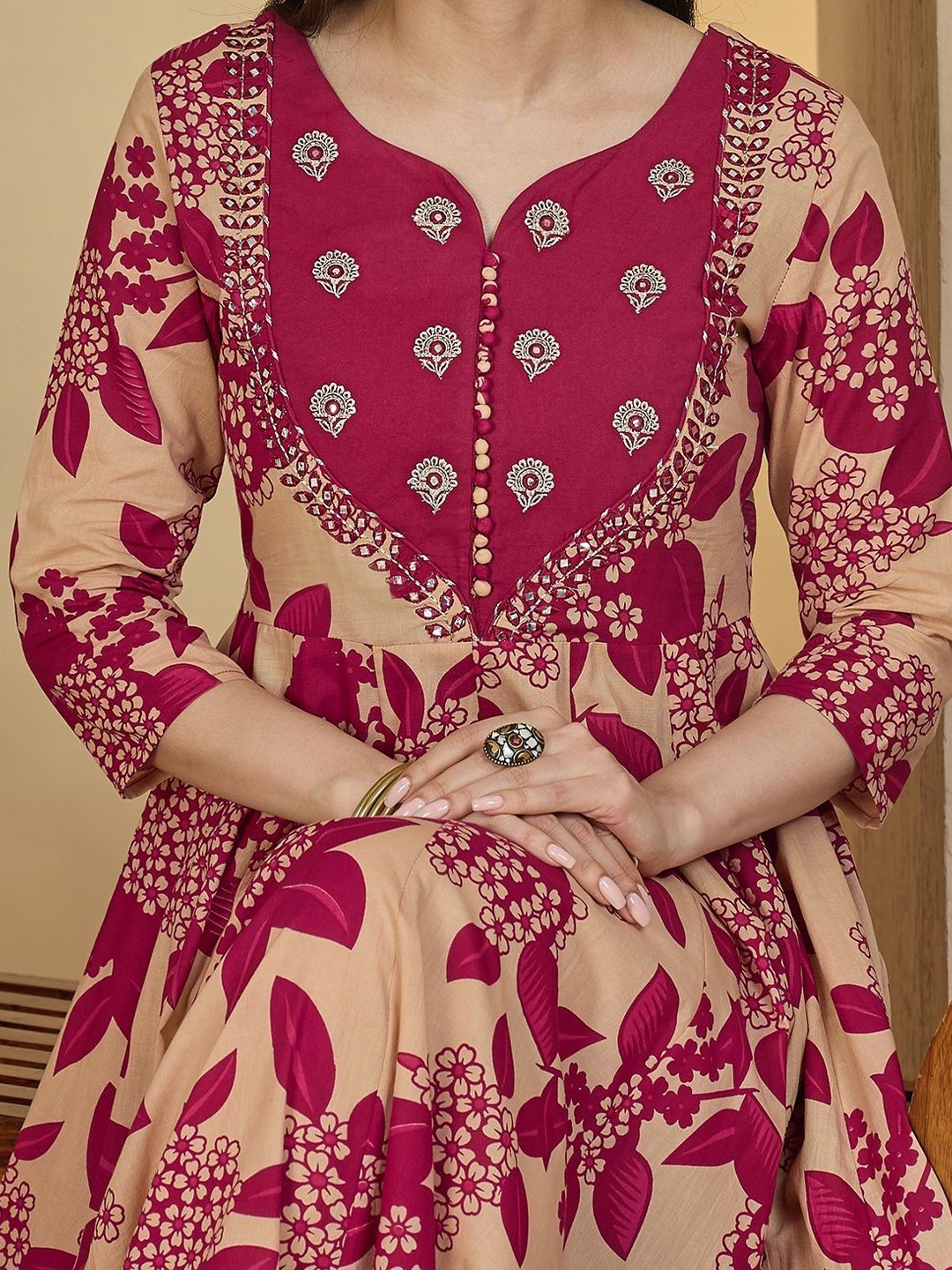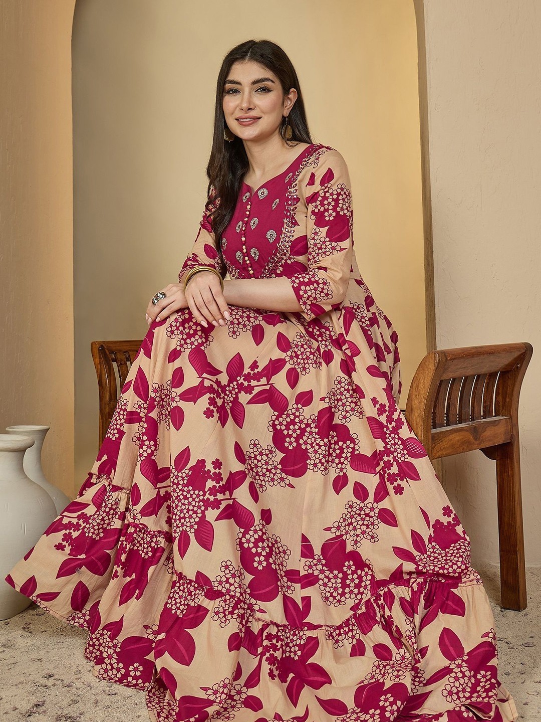 Indian Women Beige Pink Cotton Printed Festive Anarkali Kurta Kurti Long Dress