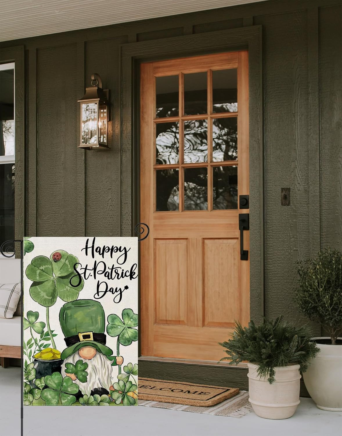 Happy St Patricks Day Garden Flags for Outside, Irish Gnome with Lucky Shamrocks