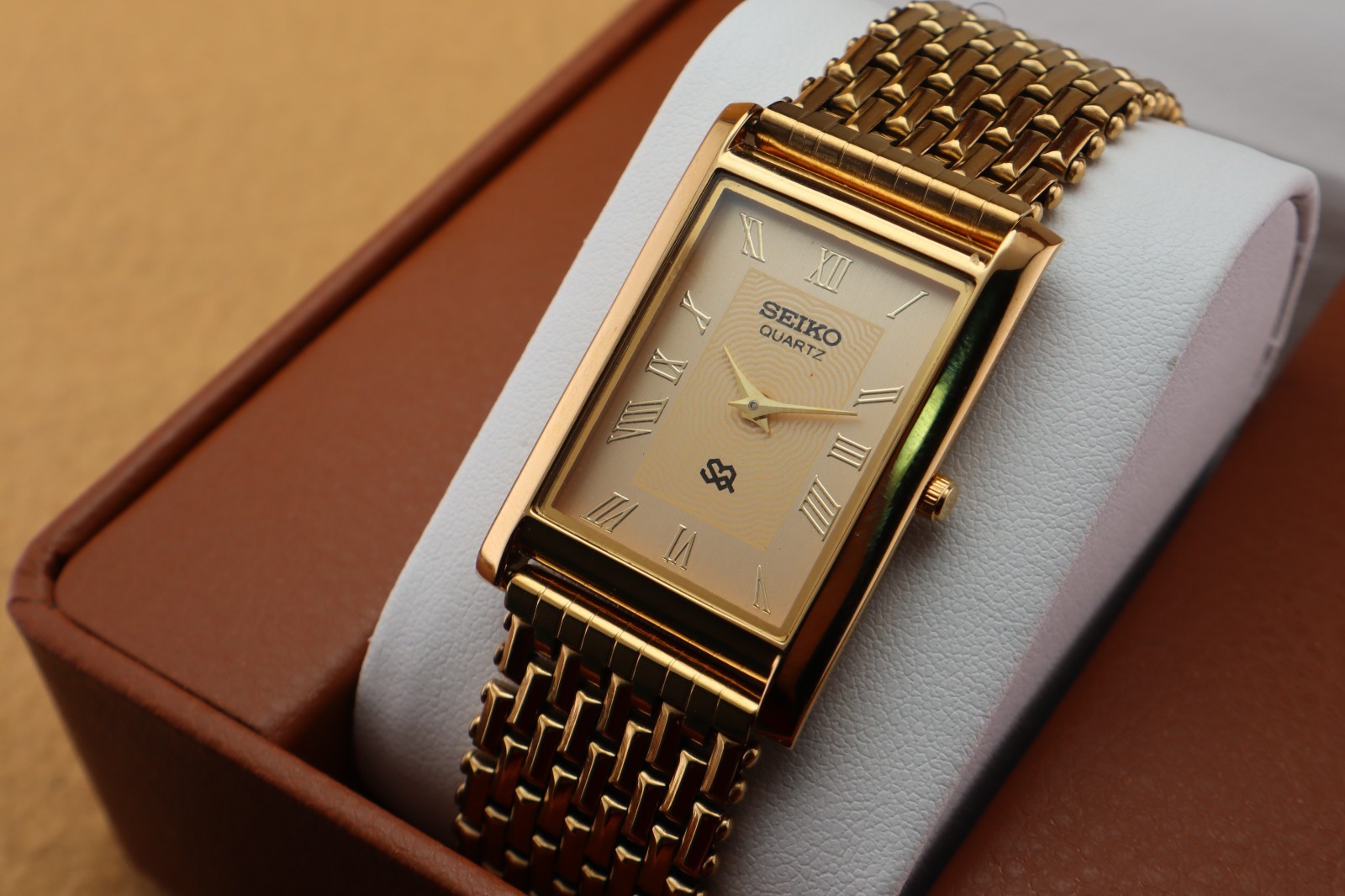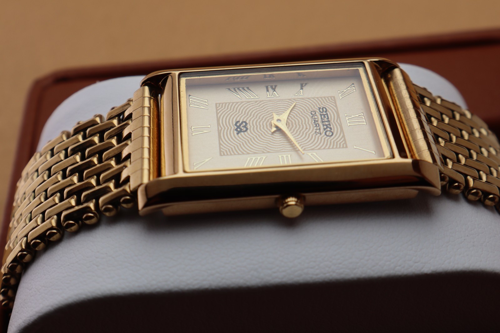 Vintage Seiko Slim Quartz Men's Wrist Watch Gold Dial with Gold Bracelet.