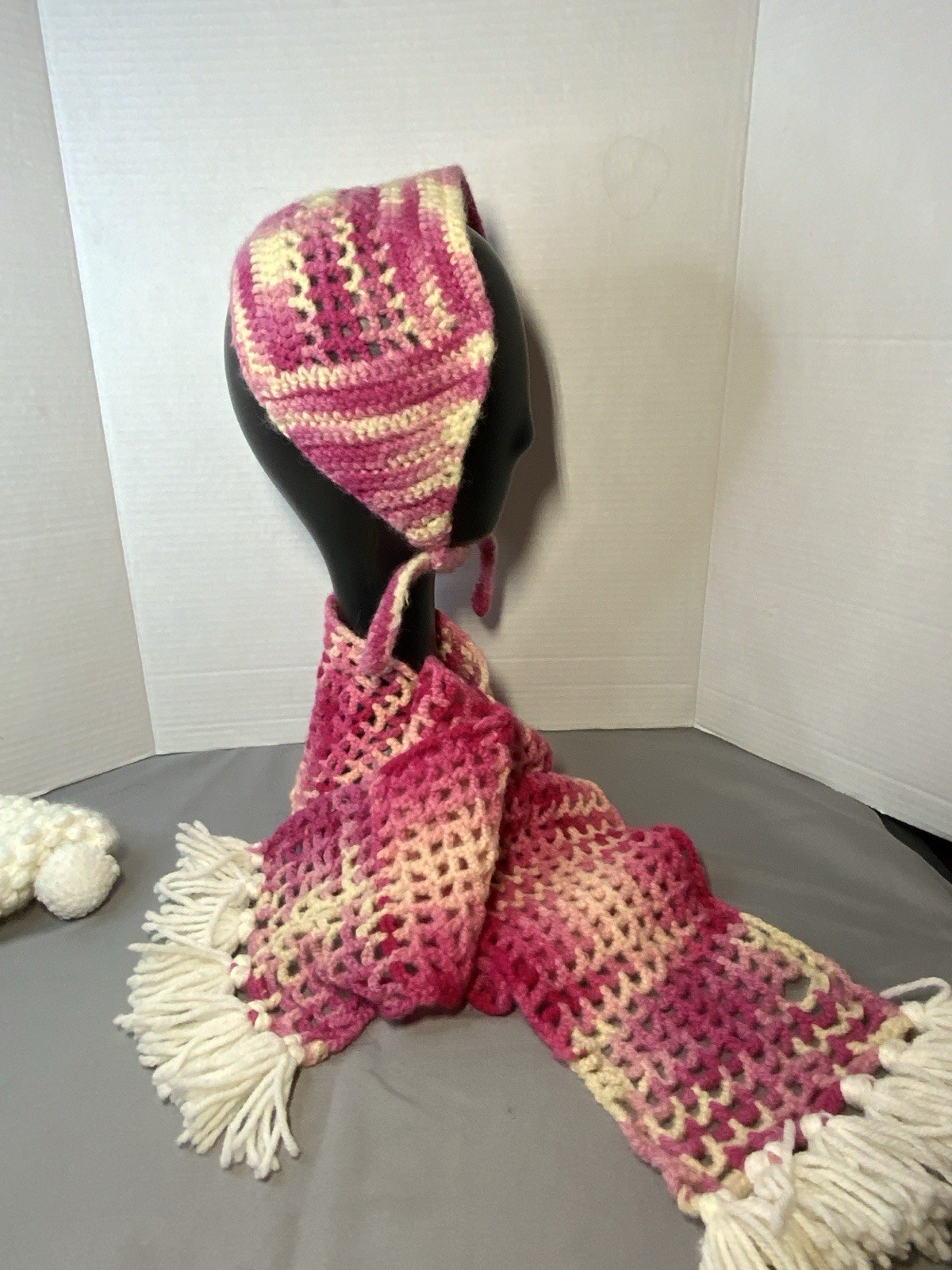 Vintage Scarf And Bonnet Hand Crocheted, Vintage Popcorn stitch Girls Bonnet