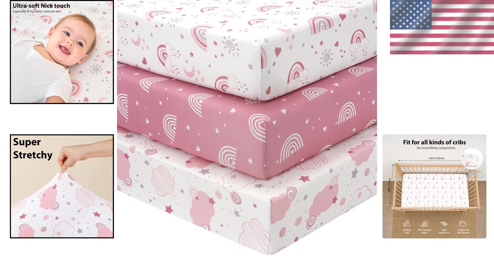 Baby Crib Sheets Girl Pink Rainbow 3 Pack Fitted Toddler Bed Sheets