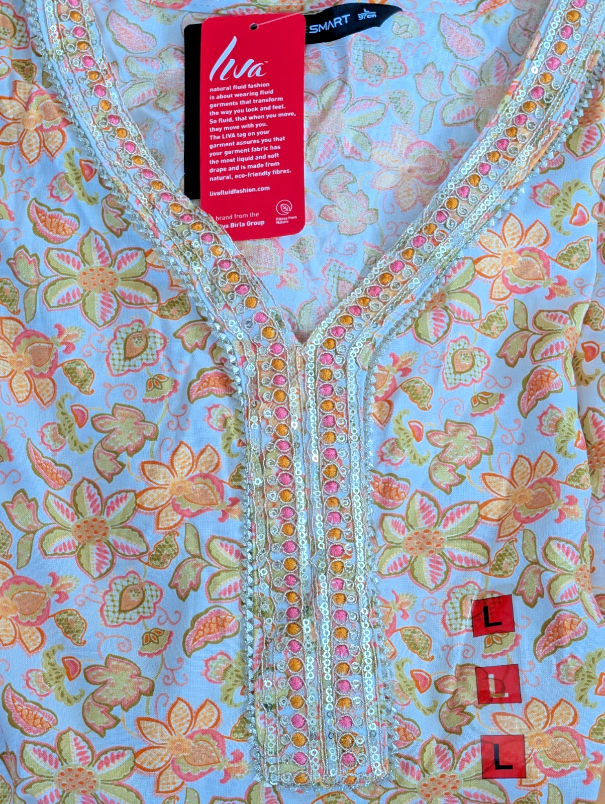 как выглядит Kurta Top Tunic Printed Embroidered V-Neck Side Pocket Festive Party Wear Sz L фото