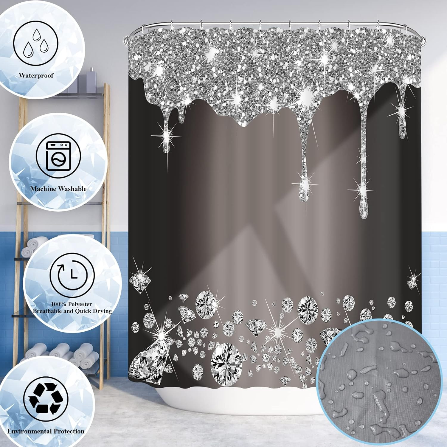 4 Pcs Glitter Diamond Shower Curtain Sets, Black Silver Shiny Drips Bath Decor w