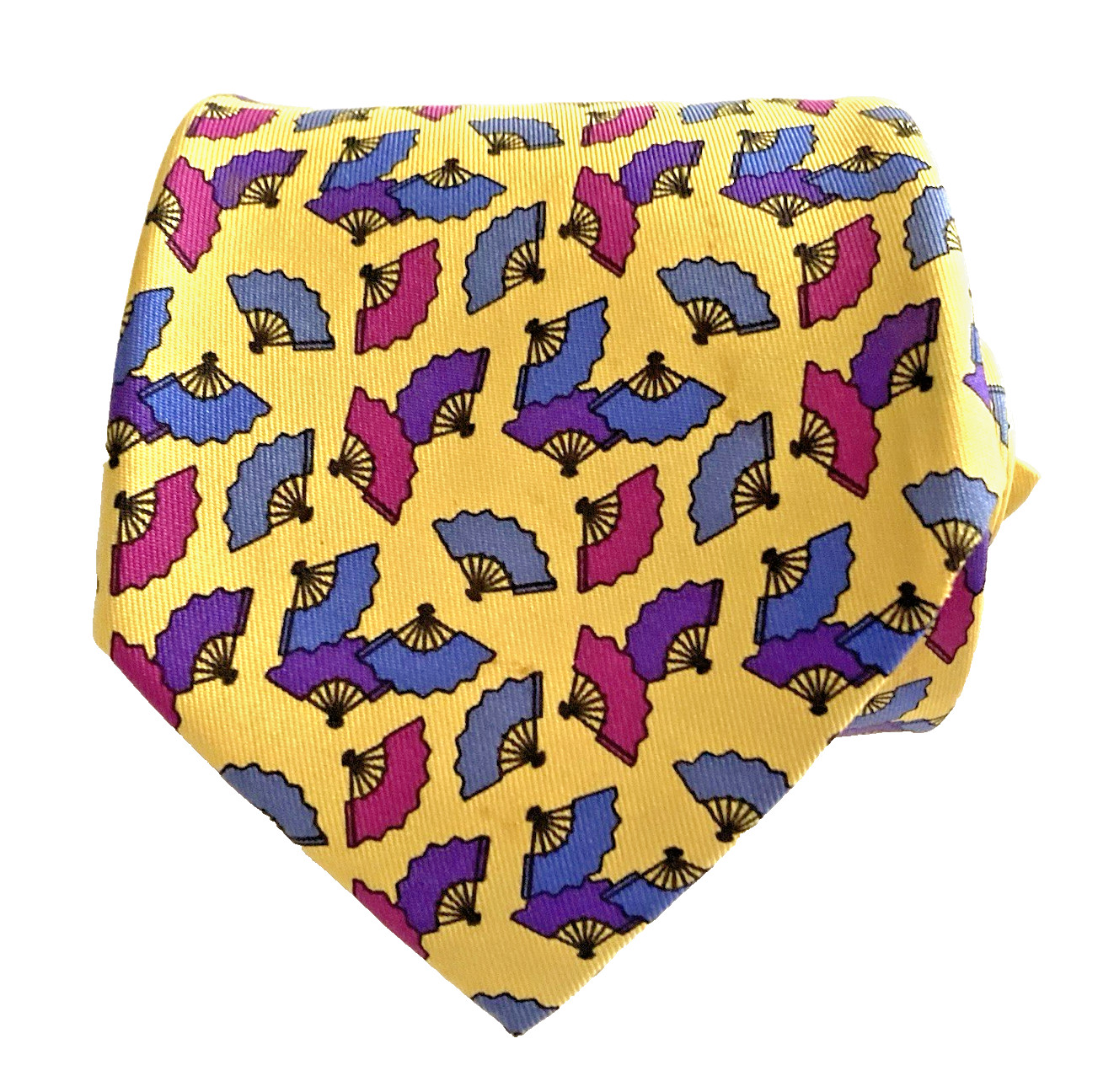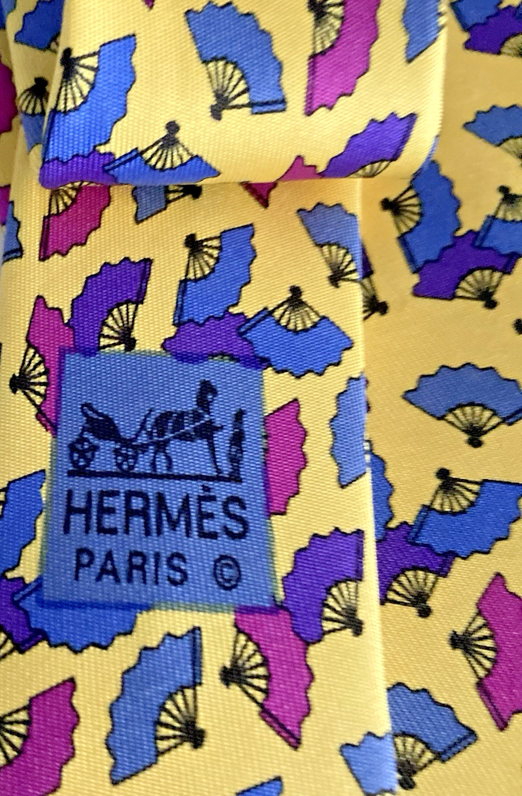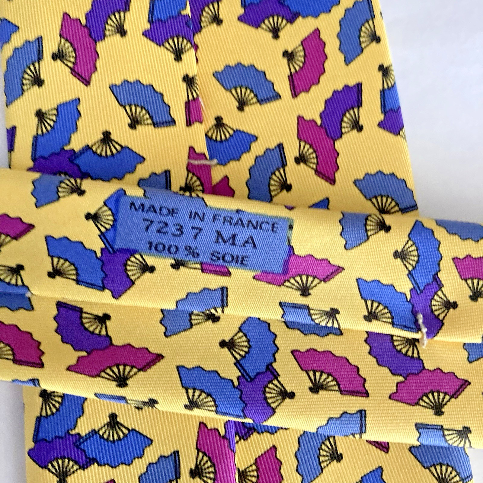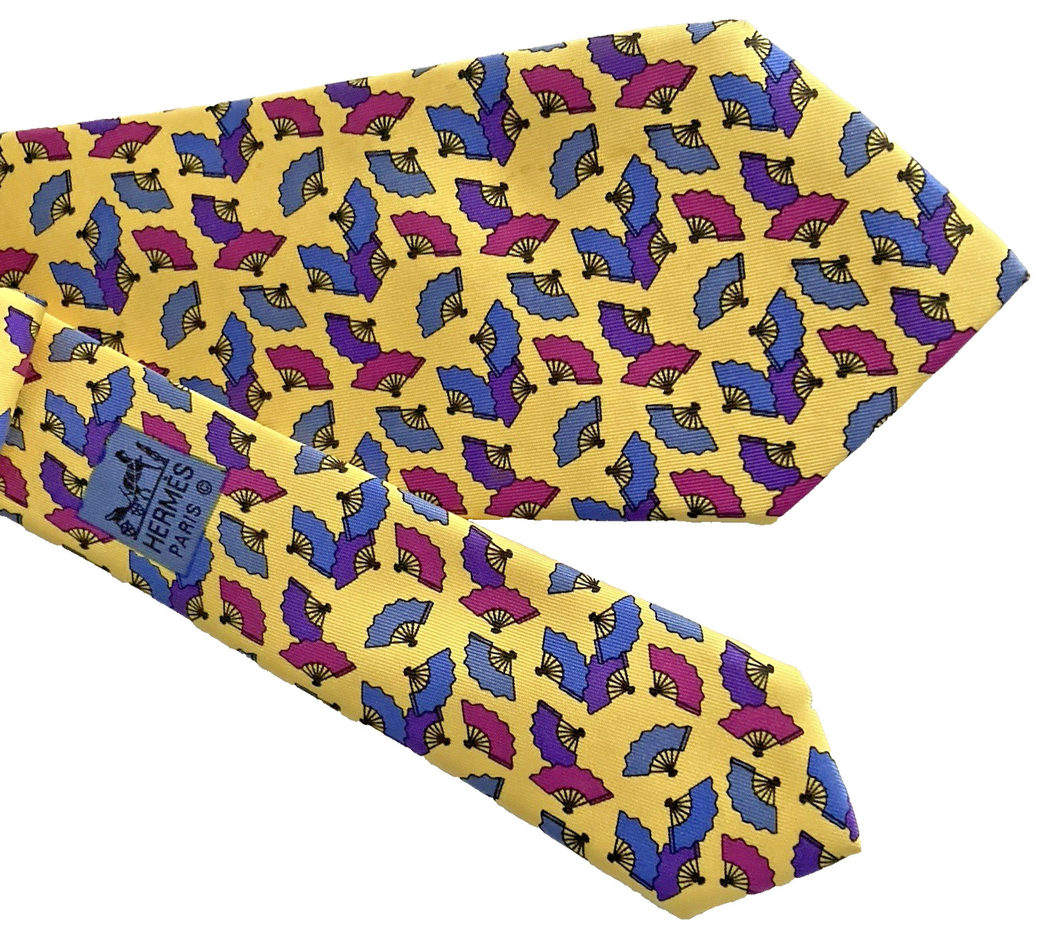 HERMES Men s Yellow Foulard Print Multicolor Hand Fans Silk Tie/ 59 France