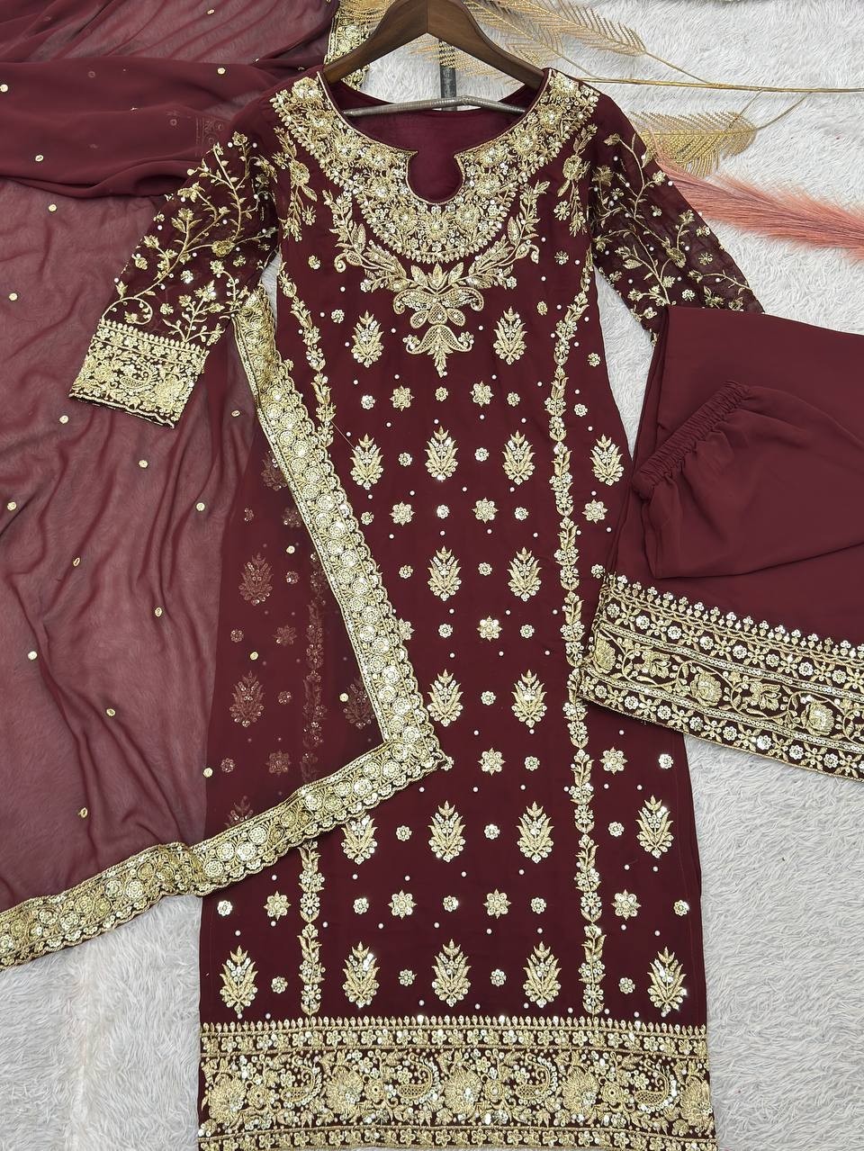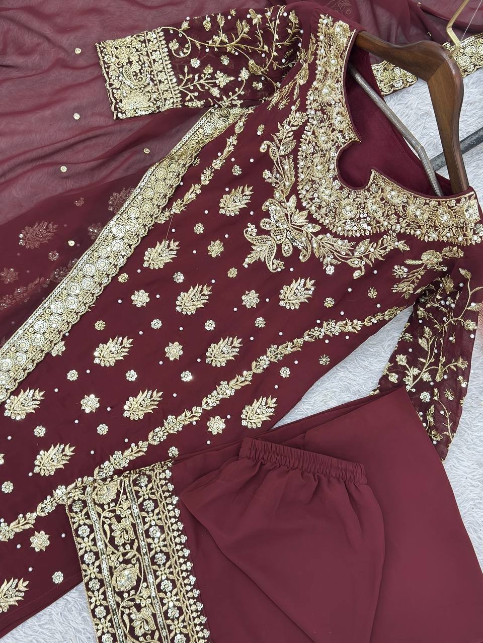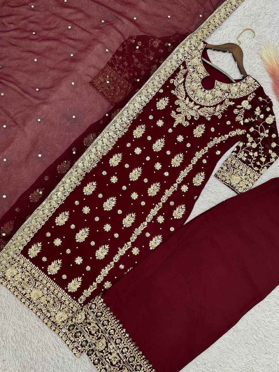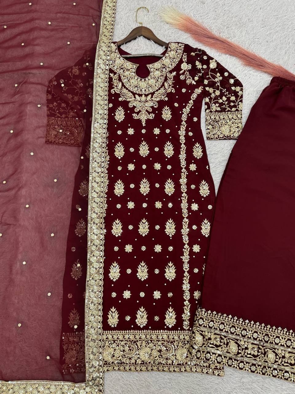 как выглядит New Designer Faux Georgette Maroon Top Palazzo With Dupatta For Wedding Wear фото