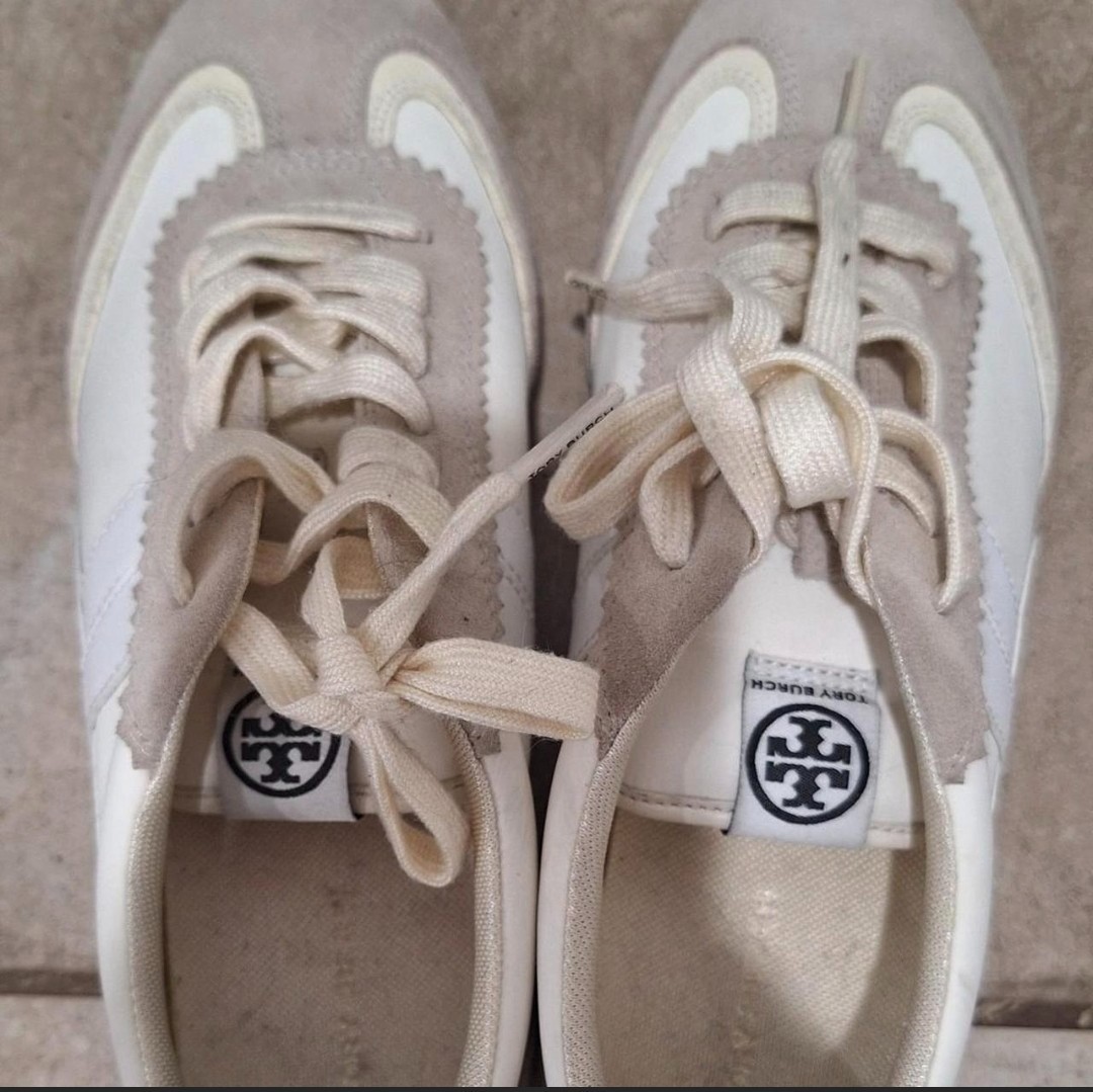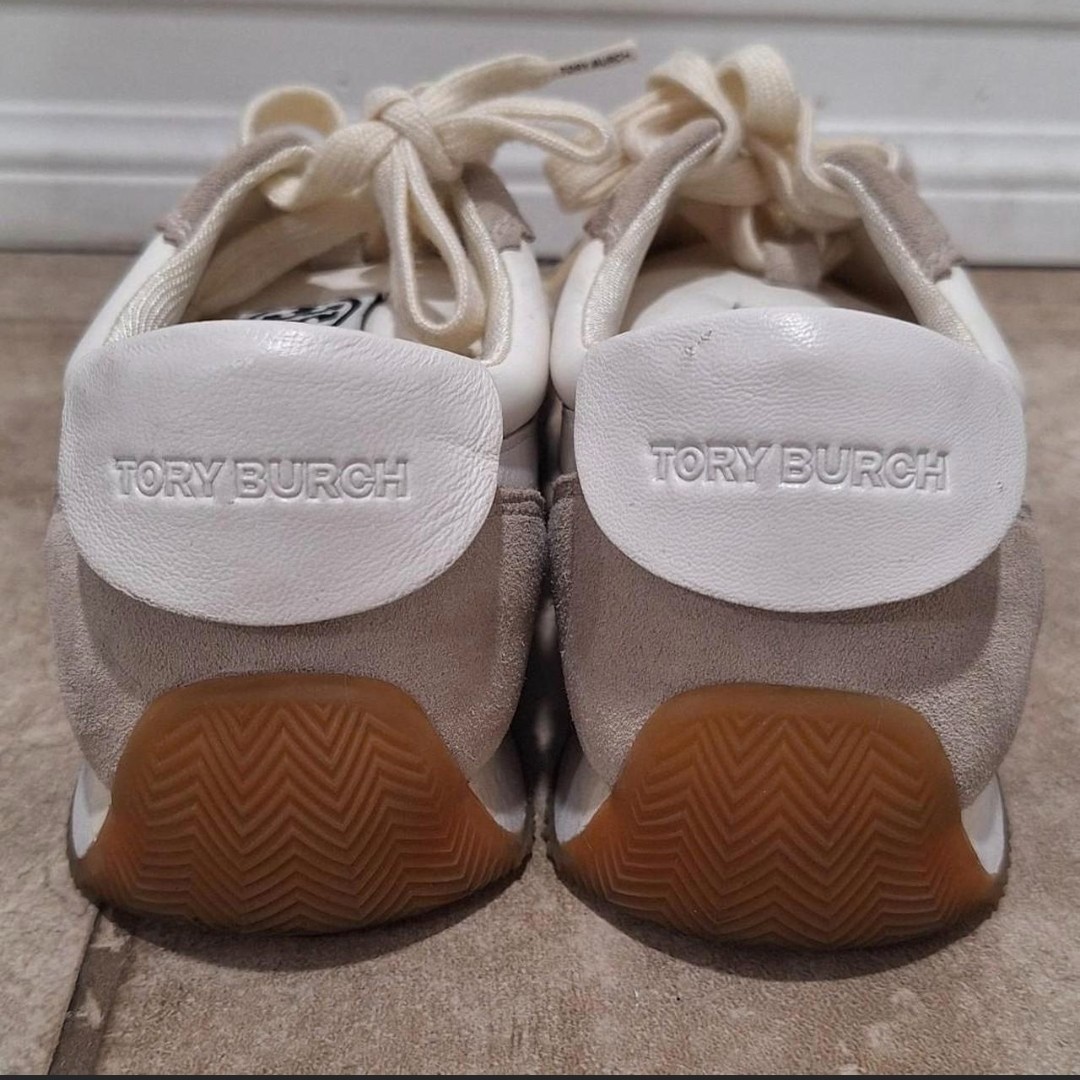 как выглядит Tory Burch Sawtooth Logo Sneakers Snow White/ Beige Suede Retro Runner Womens фото