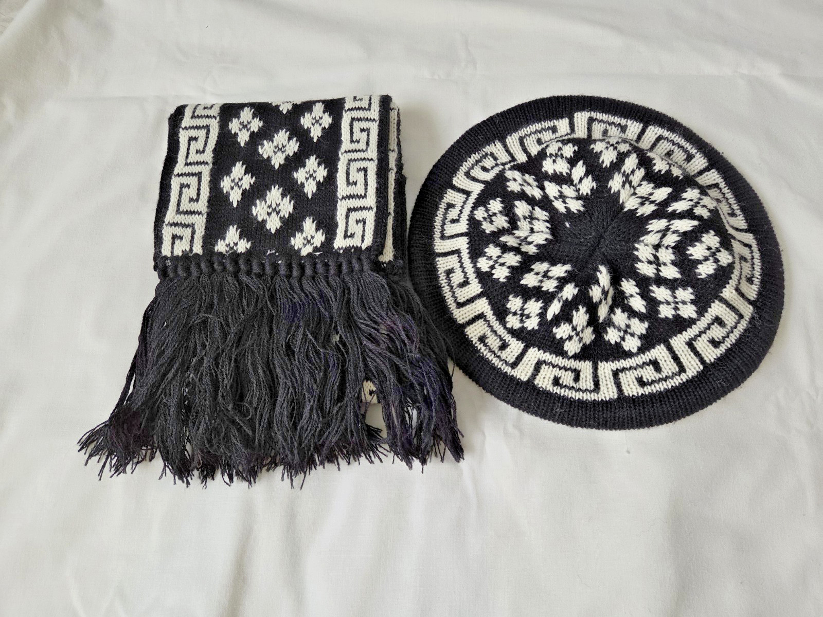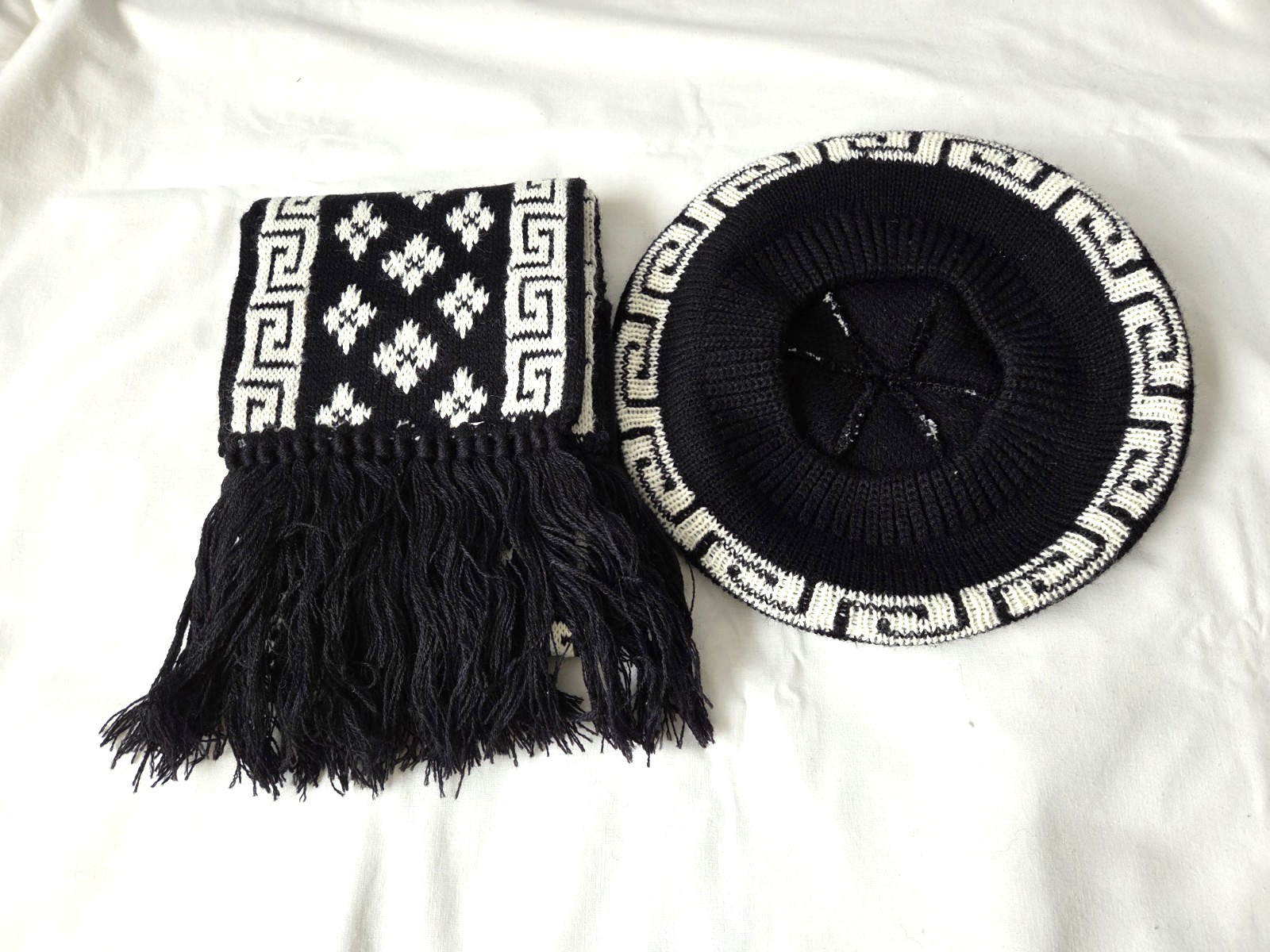 Women's Knit Hat and Scarf Set Black White Preowned