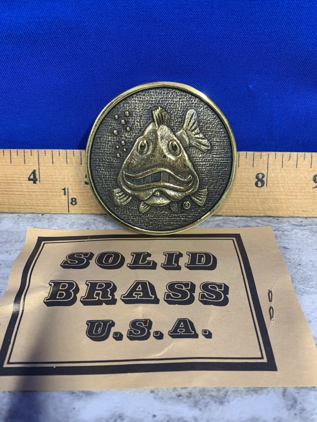 Vintage Brass BTS Belt Buckle Smiling Fish 1978 Old Stock BASS FISHING Hippie