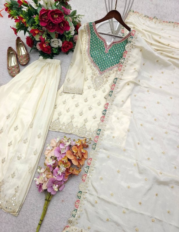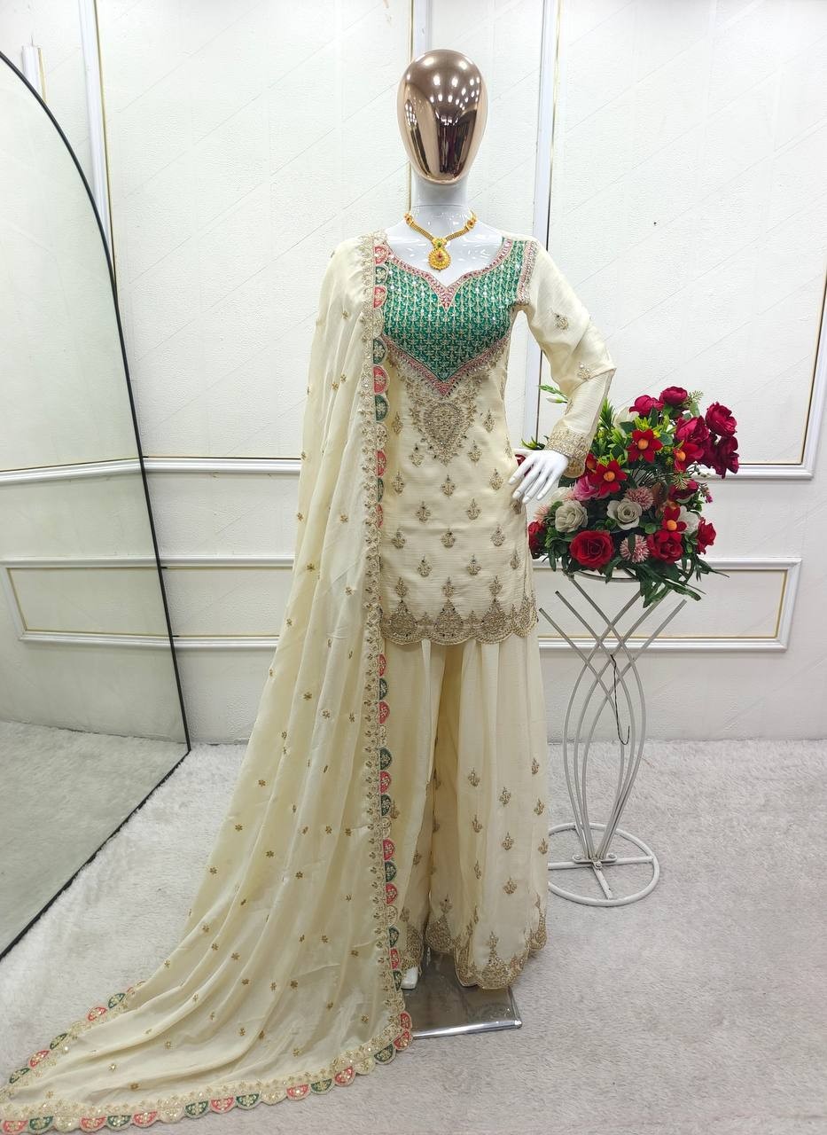 New Launching Off White Chinon Silk Top Palazzo With Dupatta For Wedding Wear