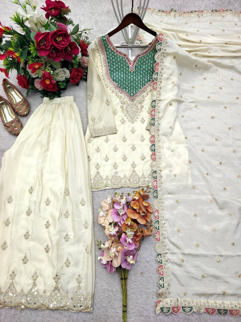 как выглядит New Launching Off White Chinon Silk Top Palazzo With Dupatta For Wedding Wear фото