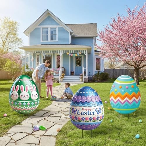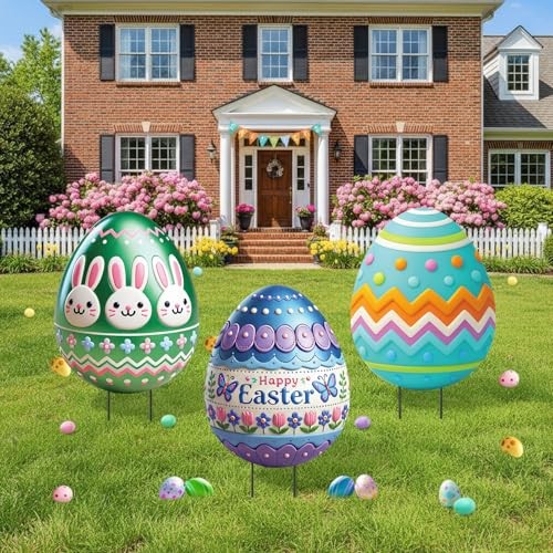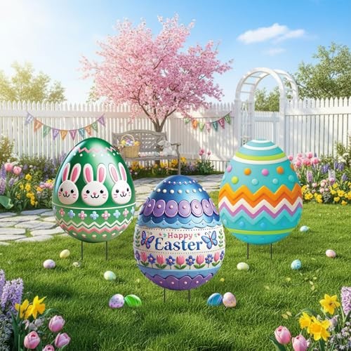 3 Pcs Easter Decorations Outdoor 3D Metal Easter Eggs Yard Signs Classic Style