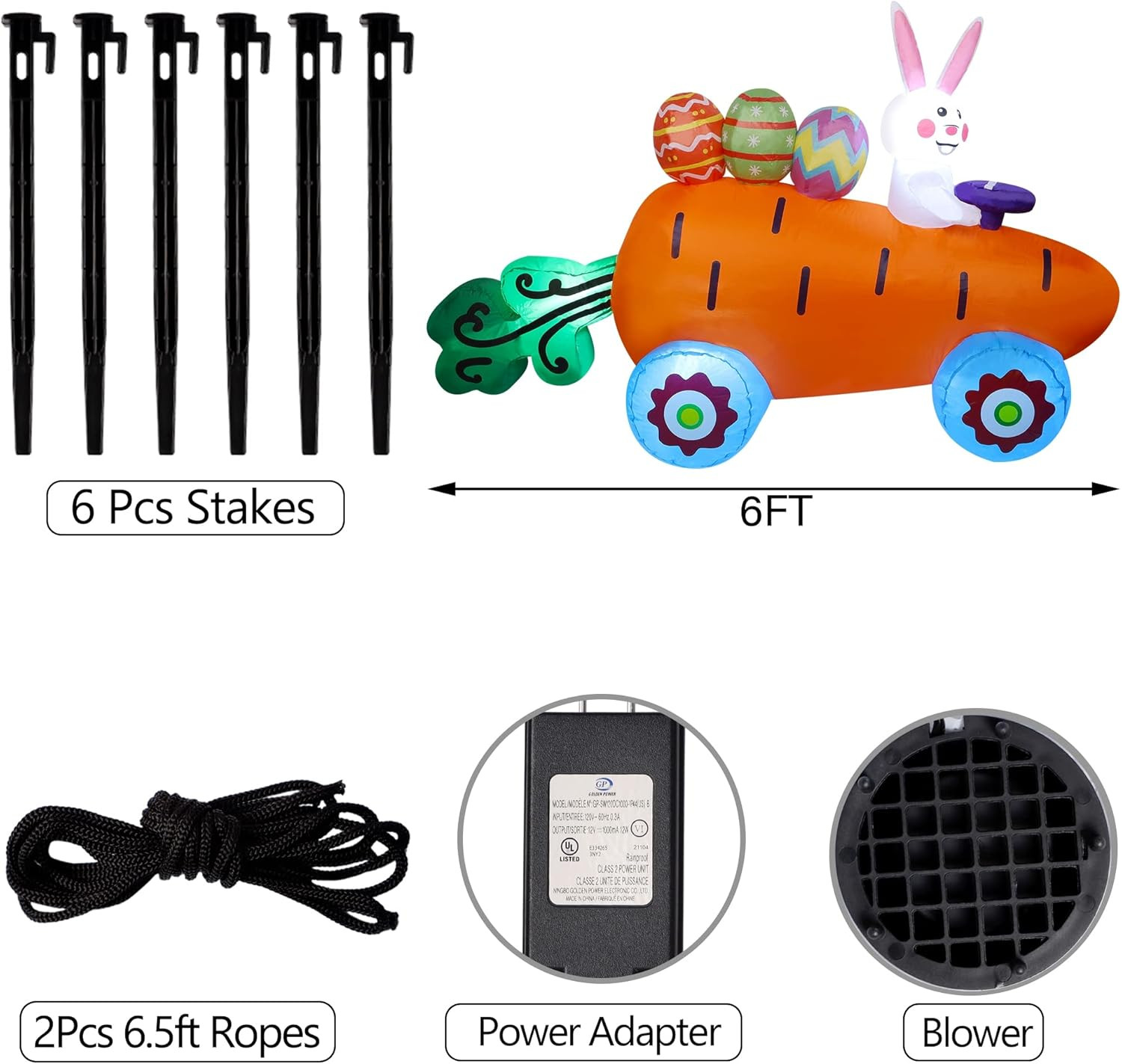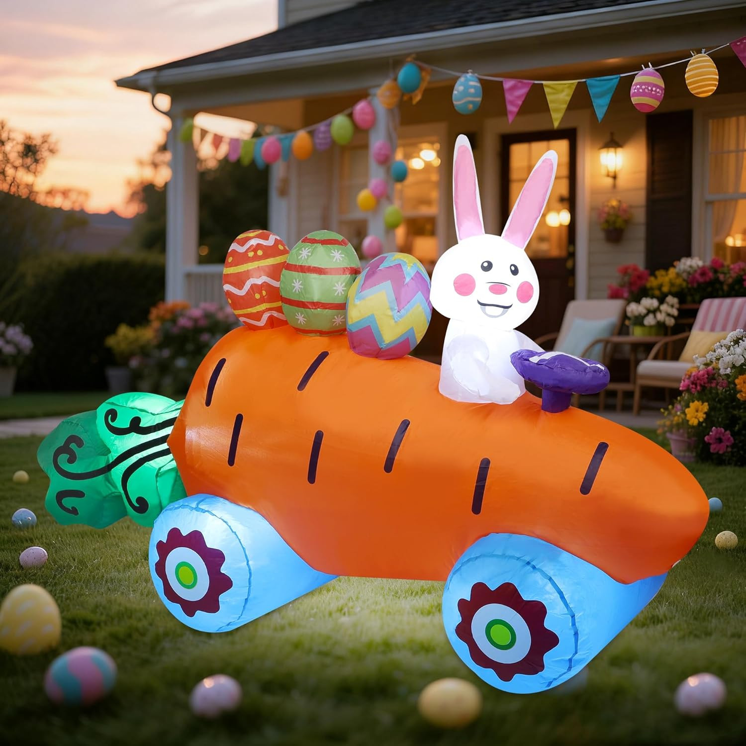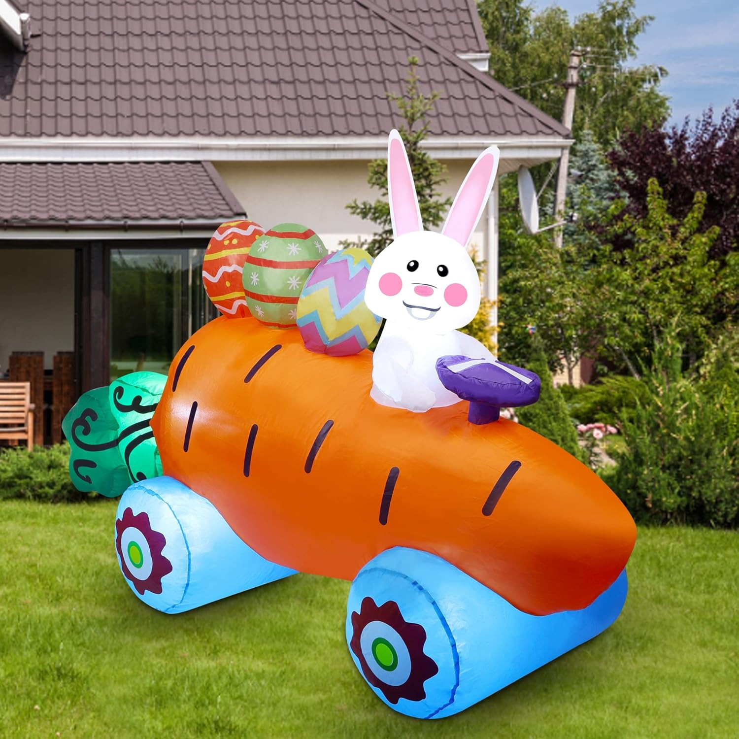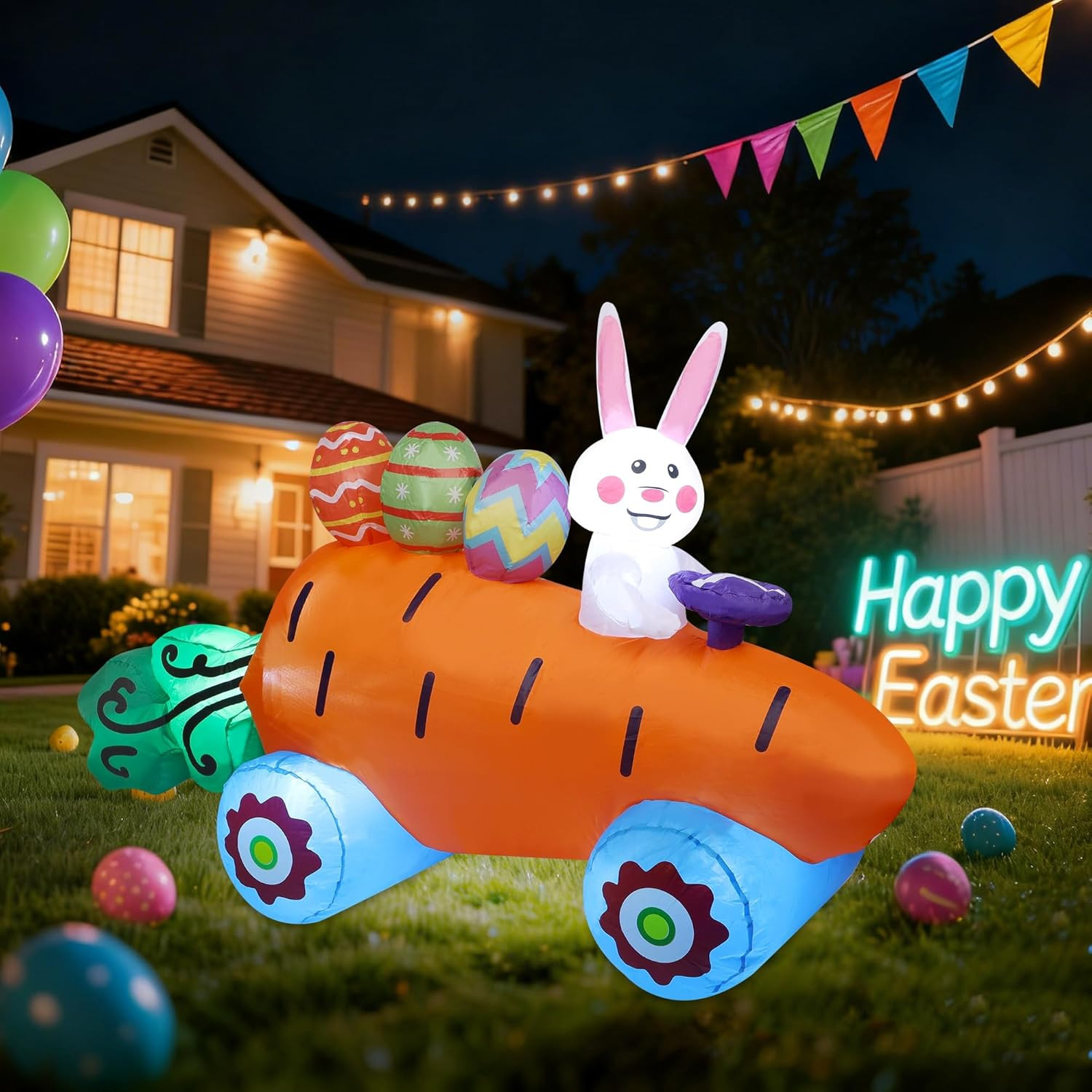 Easter Inflatables Outdoor Decorations, 6 FT Long Inflatable Bunny on Carrot Car