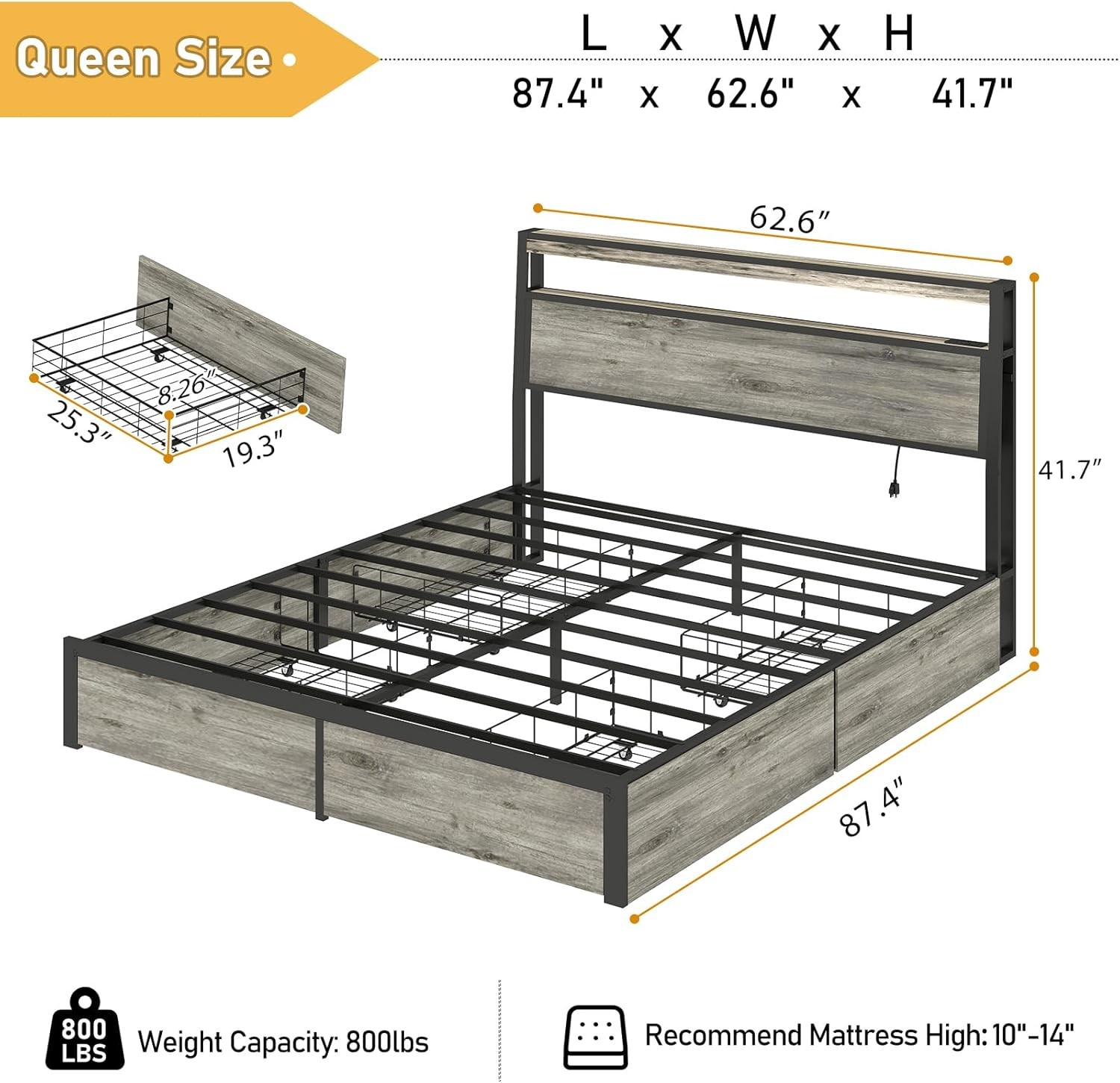 Full Queen King Bed Frame with Storage Headboard ,Charging Station LED Lights