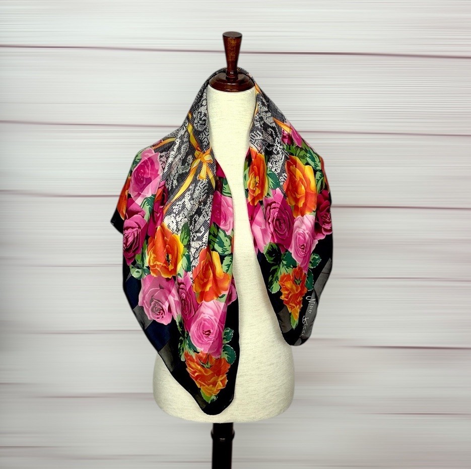 Vintage Nina Ricci Silk Scarf Black with Roses Floral and Lace Print 34x34