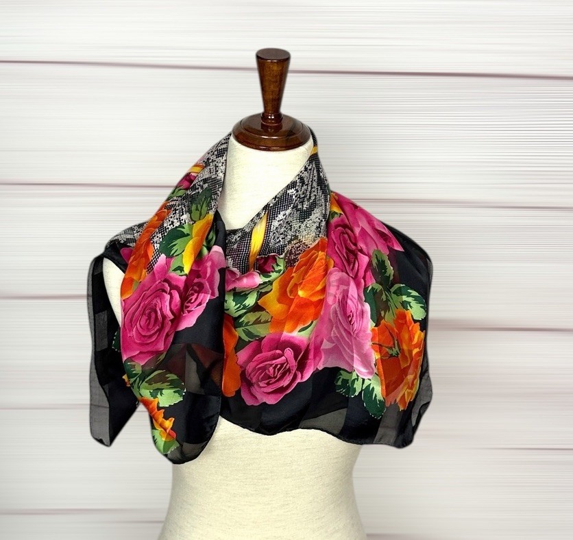 как выглядит Vintage Nina Ricci Silk Scarf Black with Roses Floral and Lace Print 34x34" фото