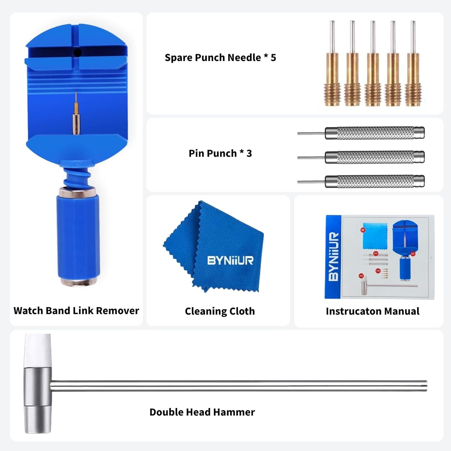 Included Components: Watch Link Removal Tool, Pin Punches, Watch Hammer, Spring Bars