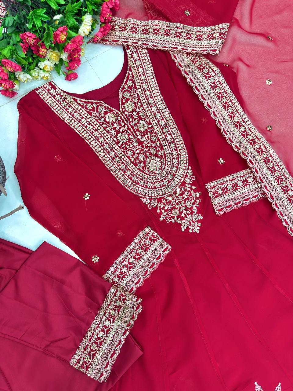 как выглядит New Launching Red Faux Georgette Salwar Kameez With Dupatta For Women Girls фото