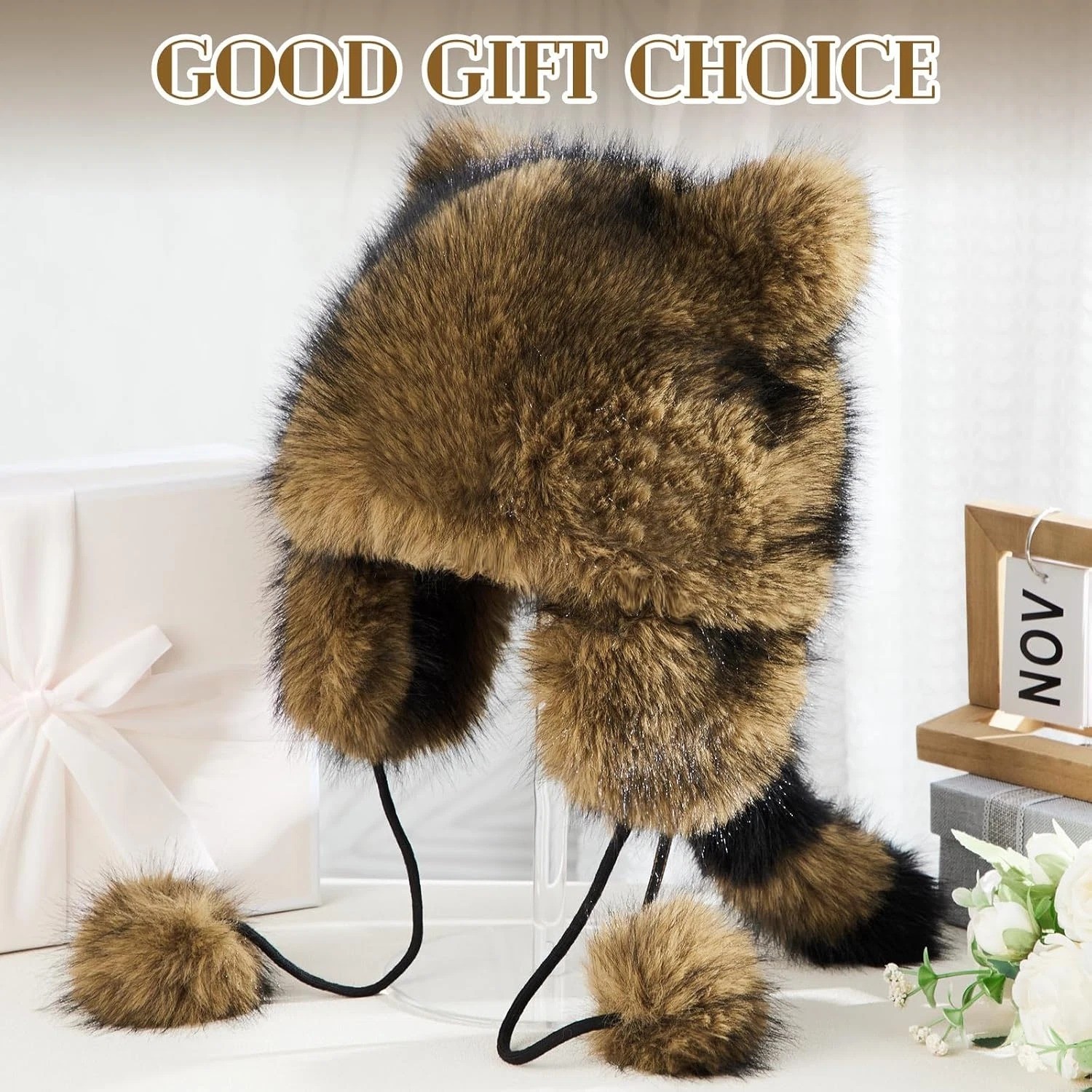 Raccoon Hat with Tail for Women Men Faux Fur Coonskin Raccoon Tail Hunting Hat