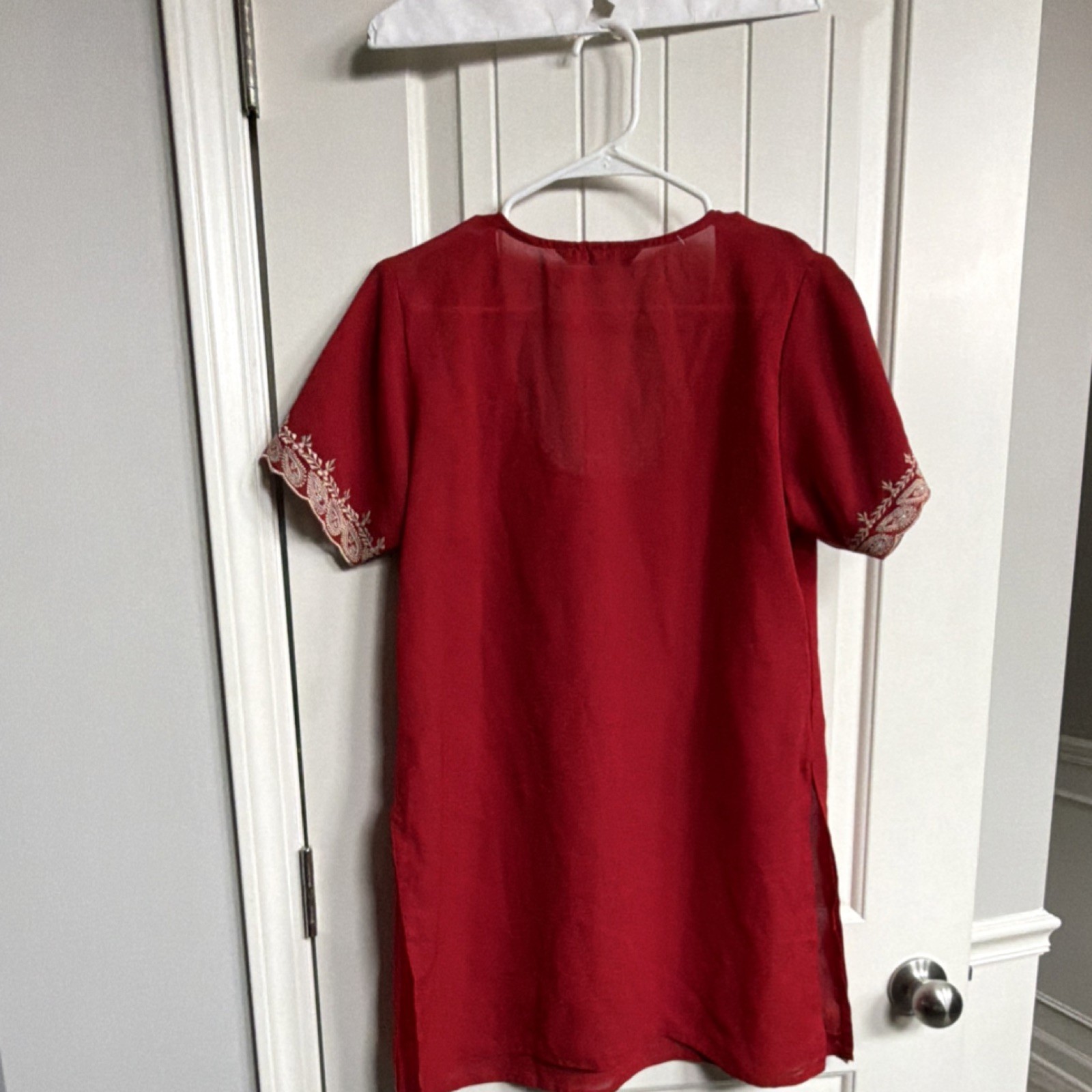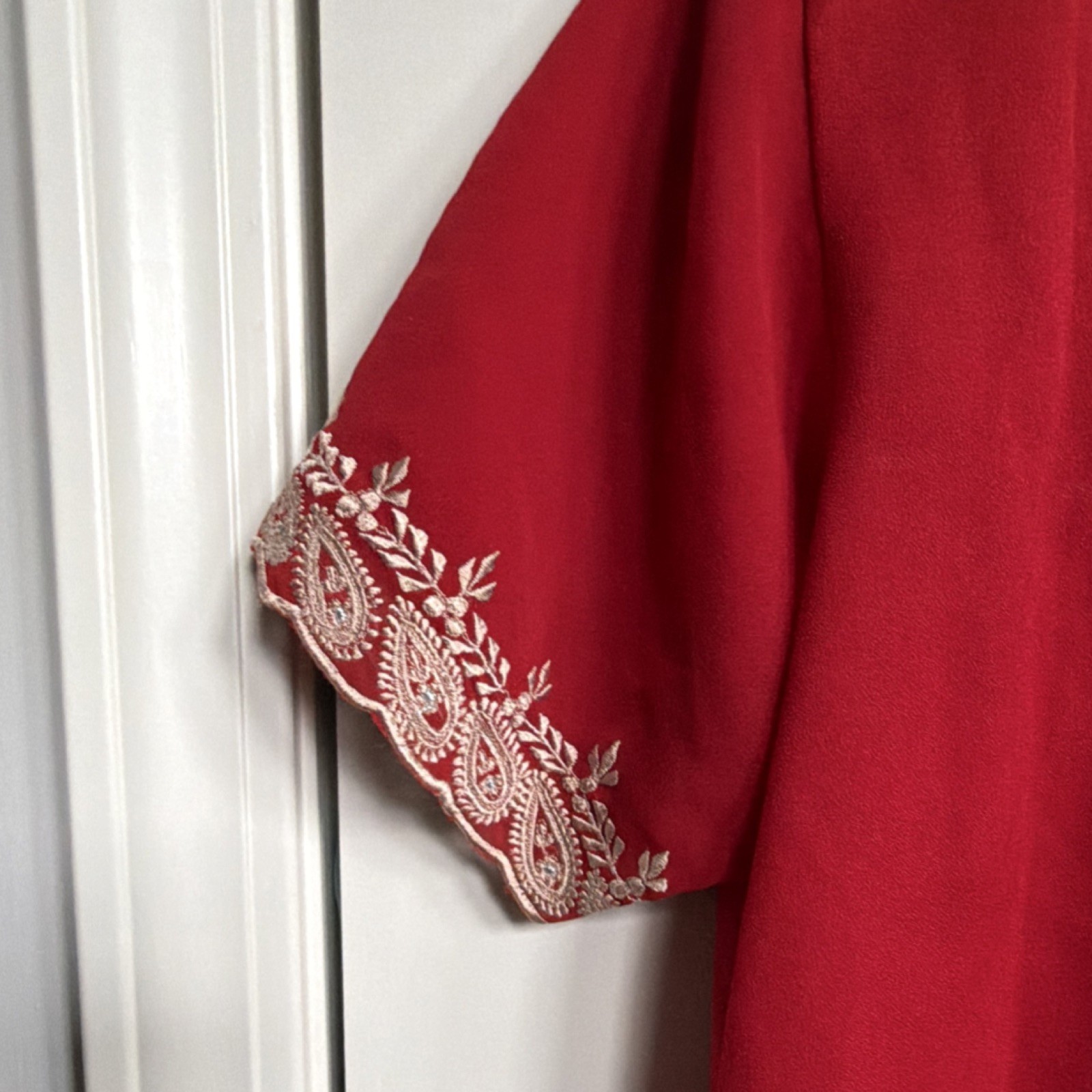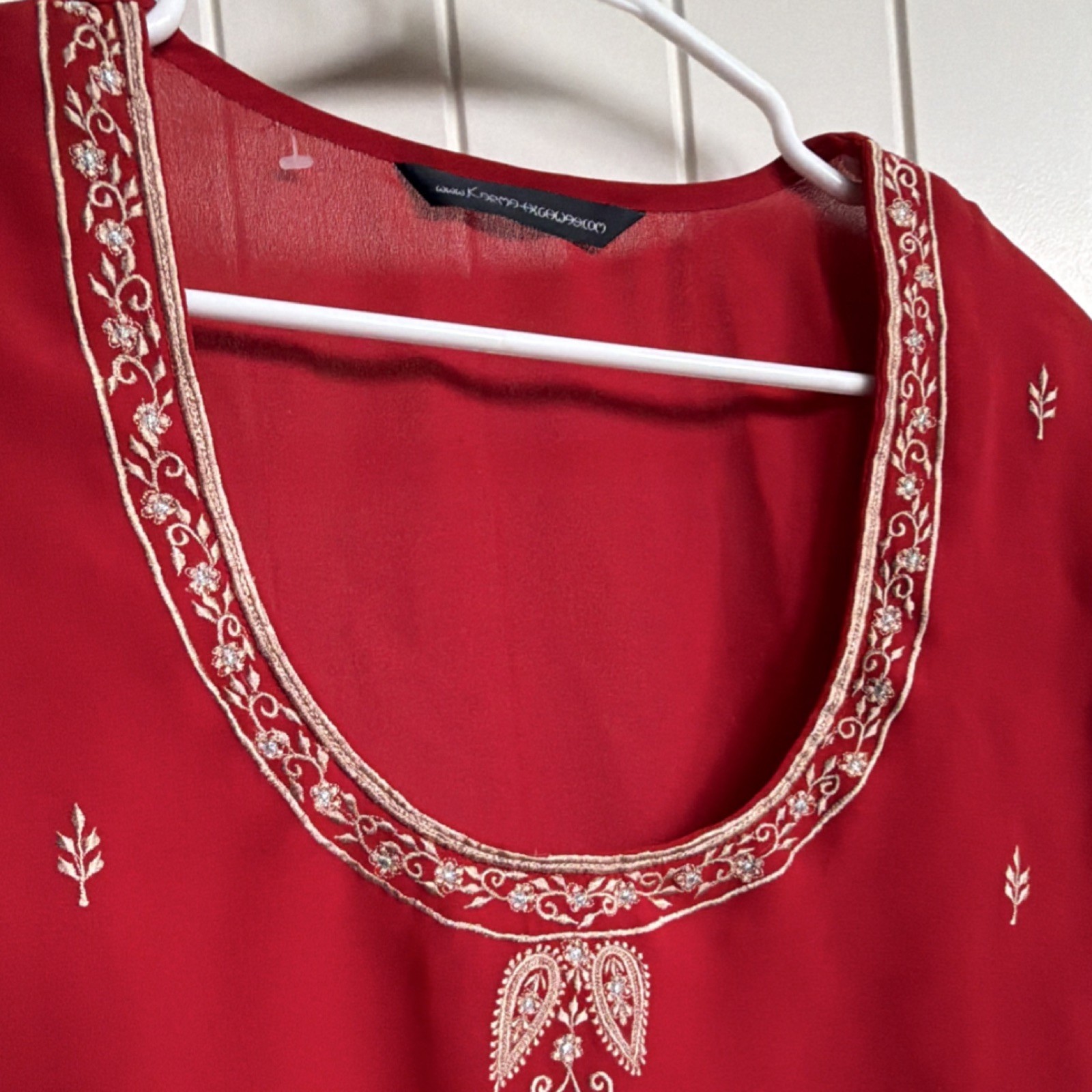 как выглядит Red Embroidered Kurta for Women with Gold Detailing, Short Sleeves фото