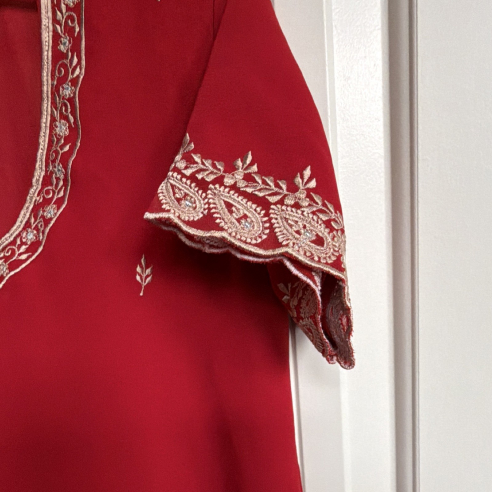 Red Embroidered Kurta for Women with Gold Detailing, Short Sleeves