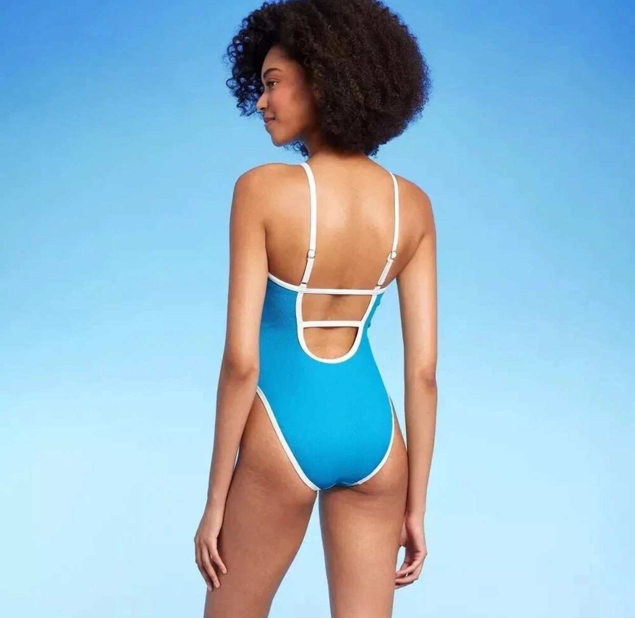 как выглядит Shade Shore Womens Contrast Binding Scoop One Piece Swimsuit Blue Size Medium фото