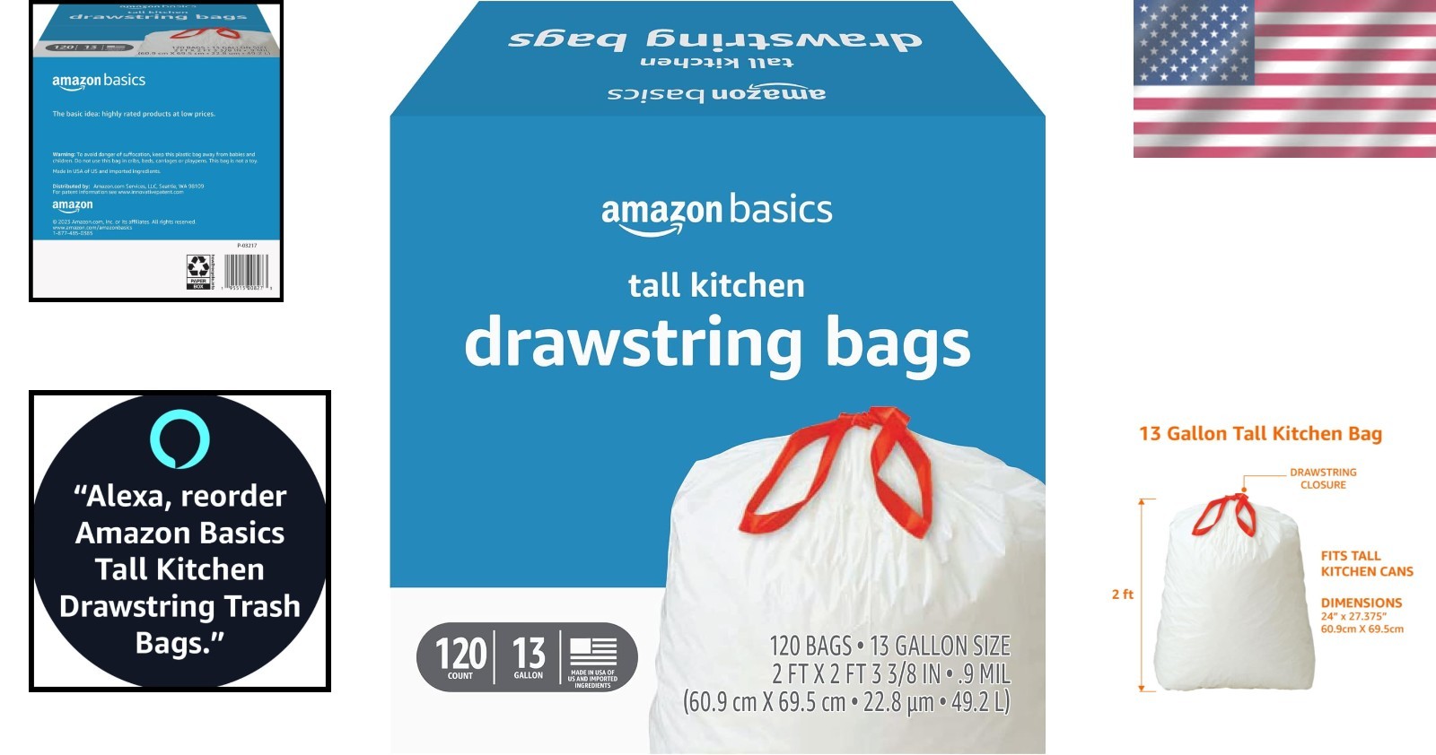 13 Gallon Kitchen Drawstring Bags, Unscented 120 Count, Effortless Disposal