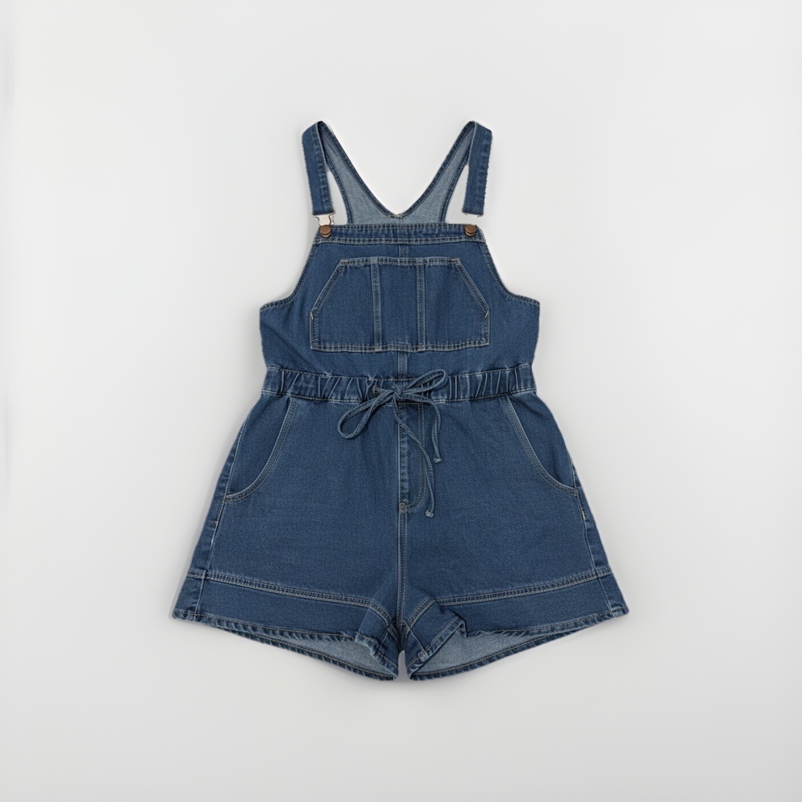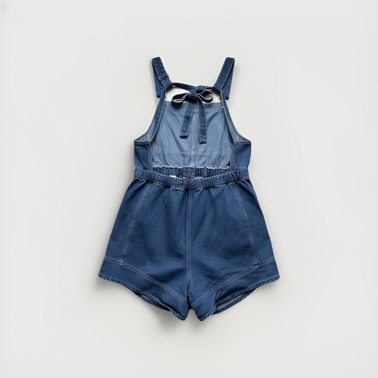 как выглядит Denim Medium Wash Blue Denim Overall Romper Sz M Backless Smocked Waist Boho фото