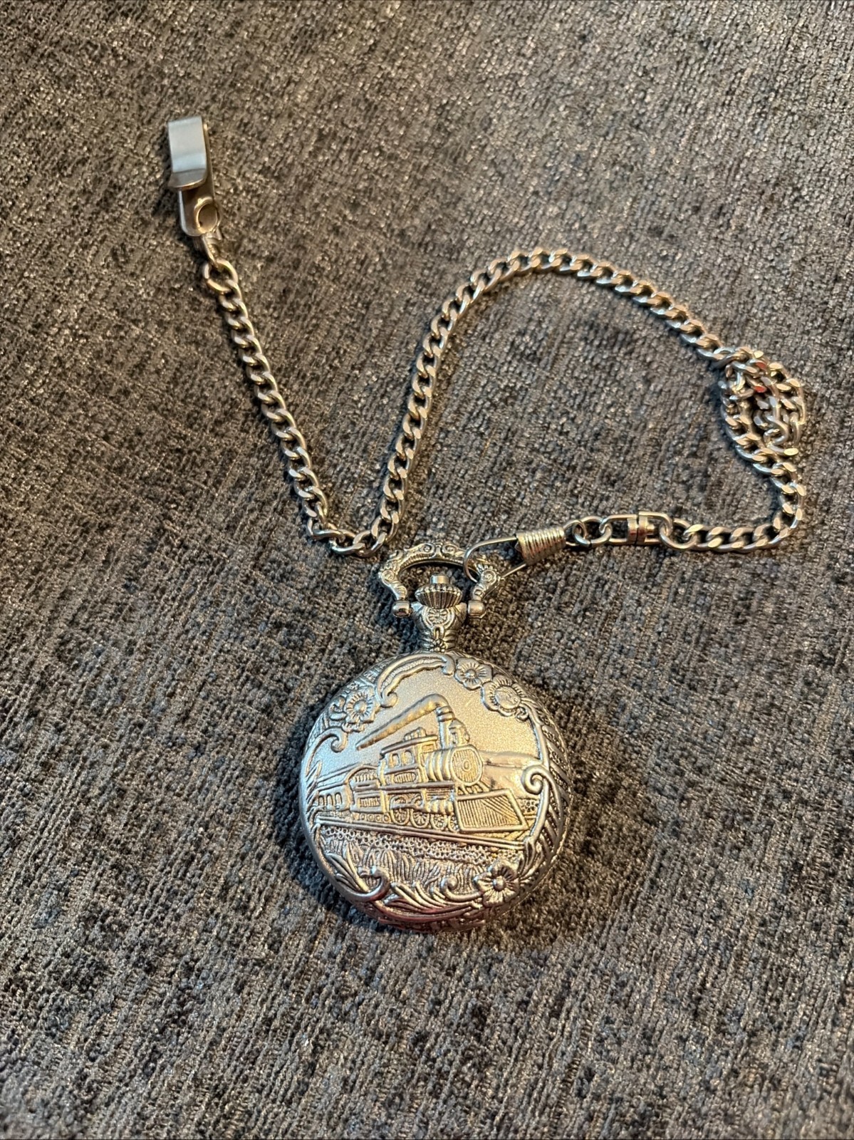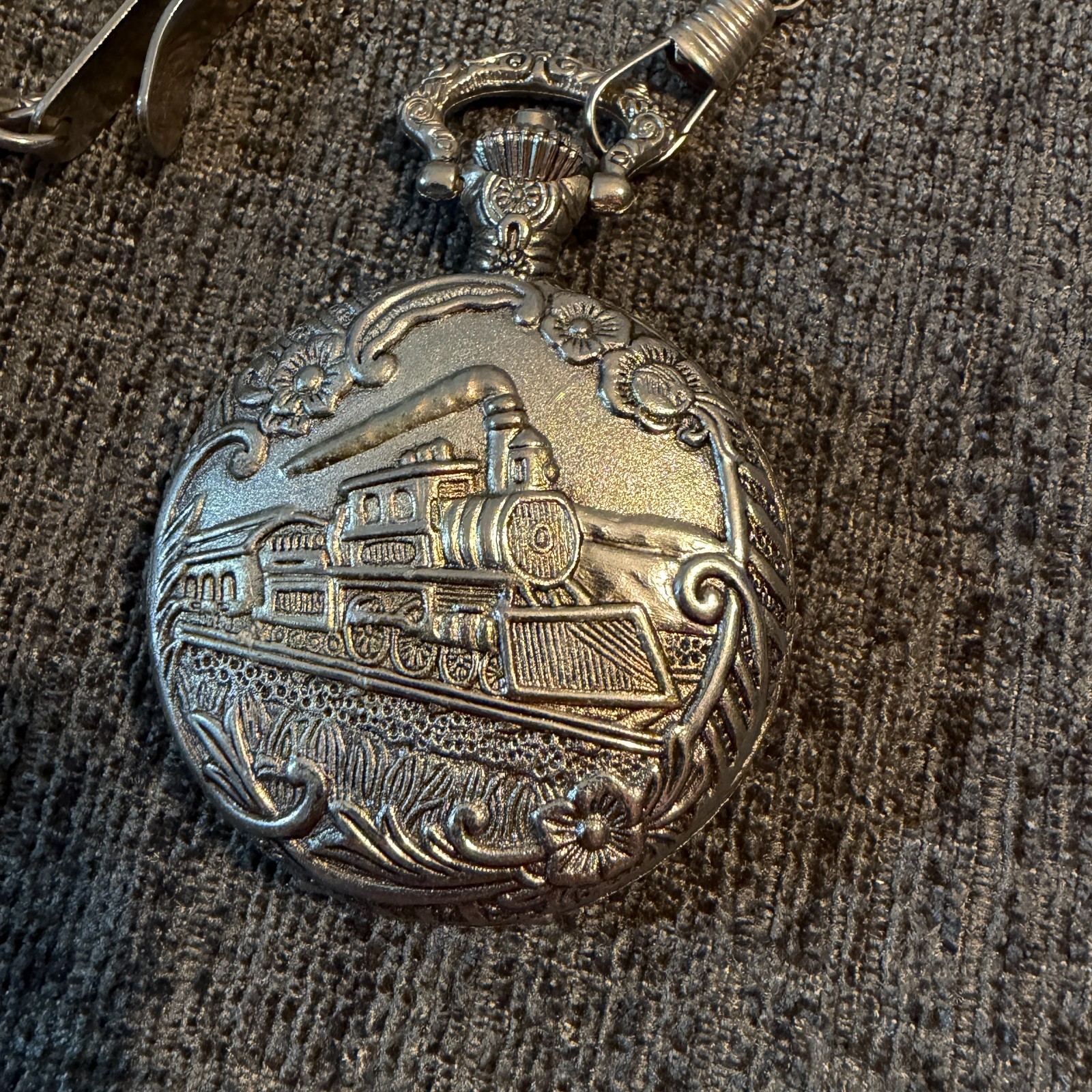 Details Pocket Watch Steam Train Locomotive Alloy Quartz Movement Chain Watch