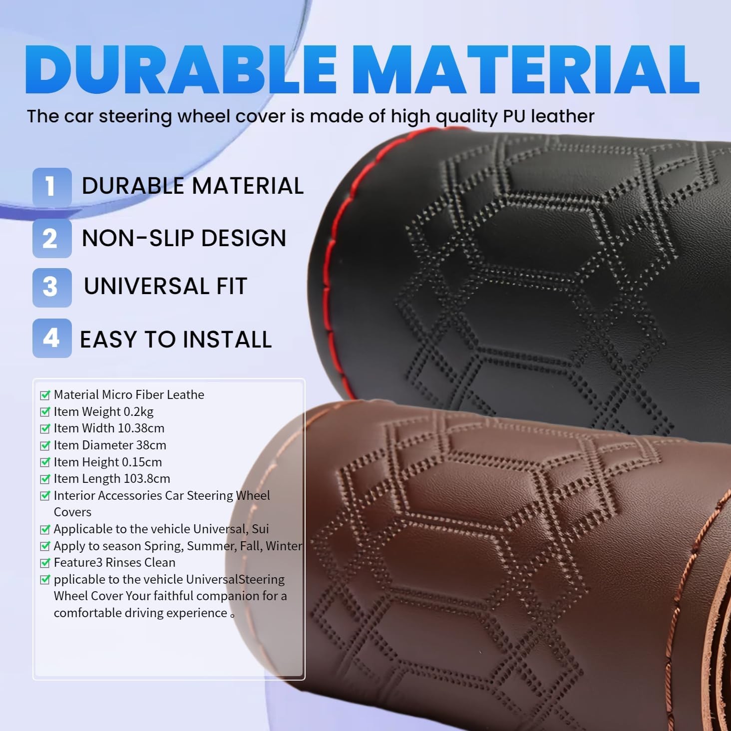 • Car Steering Wheel Cover Universal Fit Round Stitch Steering Wheel Wrap Coffee